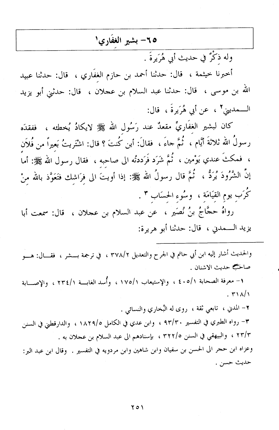 أخبرنا خيثمة، قال: حدثنا أحمد بن حازم الغفاري، قال: حدثنا عبيد الله بن موسى، قال: حدثنا عبد السلام بن عجلان، قال: حدثني أبو يزيد المديني، عن أبي هريرة، قال: كان لبشير الغفاري مقعد عند رسول الله صلى الله عليه وسلم لا يكاد يخطئه، ففقده رسول الله ثلاثة أيام، ثم جاء، فقال: أين كنت؟ قال: اشتريت بعيرًا من فلان، فمكث عندي يومين، ثم شرد فرددته إلى صاحبه، فقال رسول الله صلى الله عليه وسلم: أما إن الشرود يرد، ثم قال رسول الله صلى الله عليه وسلم: «إذا أويت إلى فراشك فتعوذ بالله من كرب يوم القيامة، وسوء الحساب» .