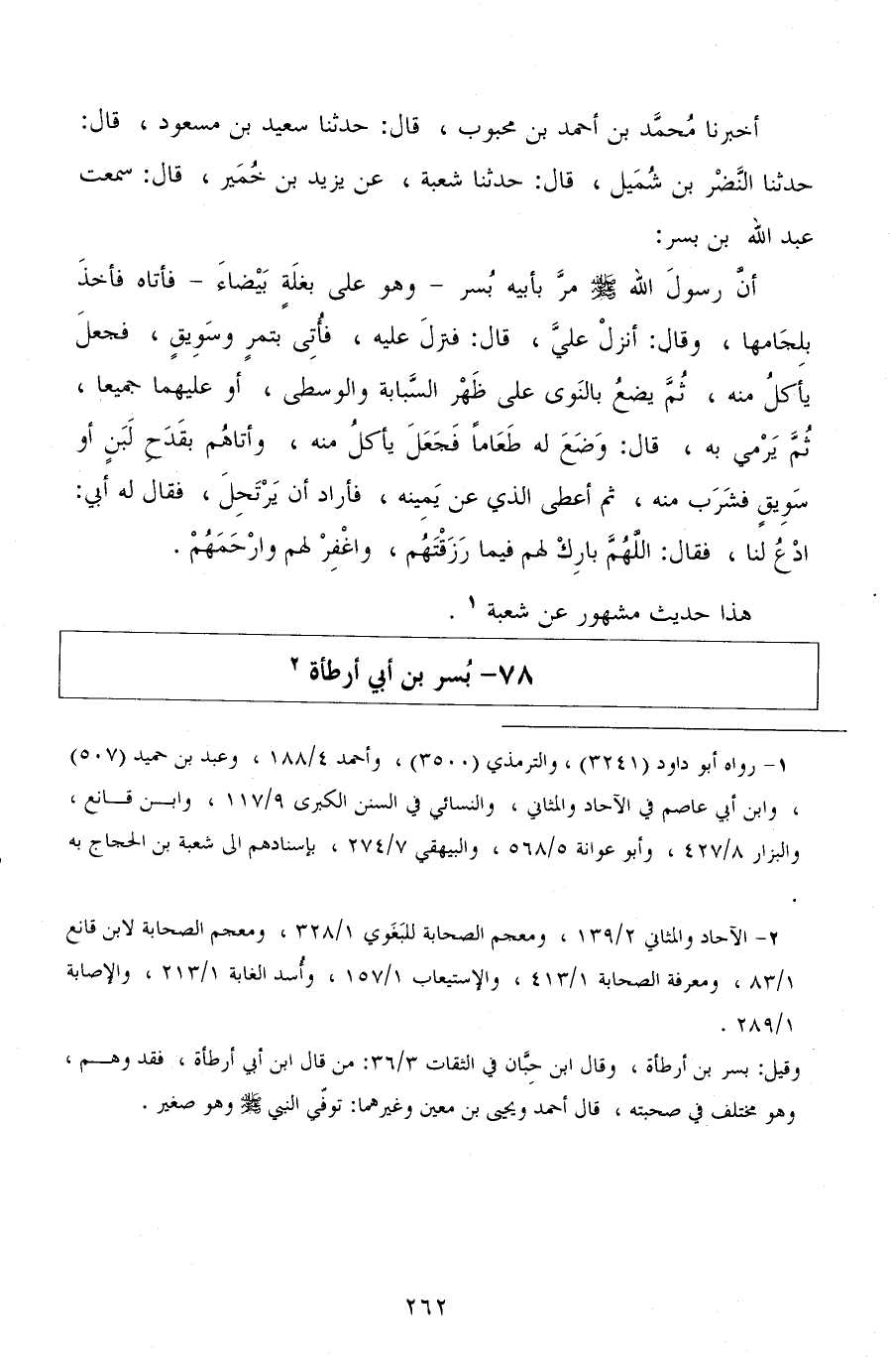 أخبرنا محمد بن أحمد بن محبوب، قال: حدثنا سعيد بن مسعود، قال: حدثنا النضر بن شميل، قال: حدثنا شعبة، عن يزيد بن خمير، قال: سمعت عبد الله بن بسر: أن رسول الله صلى الله عليه وسلم مر بأبيه بسر وهو على بغلة بيضاء فأتاه فأخذ بلجامها، وقال: أنزل علي، قال: فنزل عليه، فأتي بتمر وسويق، فجعل يأكل منه، ثم يضع بالنوى على ظهر السبابة والوسطى، أو عليهما جميعا، ثم يرمي به، قال: وضع له طعامًا فجعل يأكل منه، وأتاهم بقدح لبن أو سويق فشرب منه، ثم أعطى الذي عن يمينه، فأراد أن يرتحل، فقال له أبي.