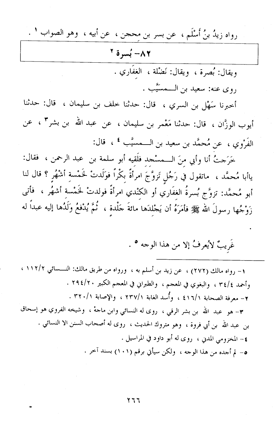 أخبرنا سهل بن السري، قال: حدثنا خلف بن سليمان، قال: حدثنا أيوب الوزان، قال: حدثنا معمر بن سليمان، عن عبد الله بن بشر، عن الفروي، عن محمد بن سعيد بن المسيب، قال: خرجت أنا وأبي من المسجد فلقيه أبو سلمة بن عبد الرحمن، فقال: يا أبا محمد، ما تقول في رجل تزوج امرأة بكرًا فولدت لخمسة أشهر؟ قال لنا أبو محمد: تزوج بسرة الغفاري أو الكندي امرأة فولدت لخمسة أشهر، فأتى زوجها رسول الله صلى الله عليه وسلم فأمره أن يجلدها مائة جلدة، ثم يدفع ولدها إليه عبدًا له.