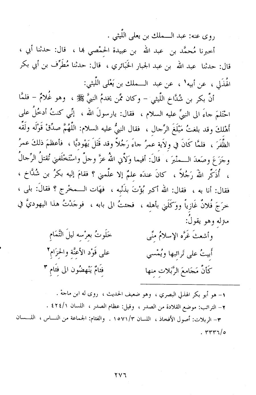 أخبرنا محمد بن عبد الله بن عبيدة الحمصي بها، قال: حدثنا أبي، قال: حدثنا عبد الله بن عبد الجبار الخبائري، قال: حدثنا مطرف بن أبي بكر الهذلي، عن أبيه، عن عبد الملك بن يعلى الليثي: أن بكر بن شداخ الليثي وكان ممن يخدم النبي صلى الله عليه وسلم، وهو غلام فلما احتلم جاء إلى النبي عليه السلام، فقال: يا رسول الله، إني كنت أدخل على أهلك وقد بلغت مبلغ الرجال، فقال النبي عليه السلام: اللهم صدق قوله ولقه الظفر، فلما كان في ولاية عمر جاء رجلا وقد قتل يهوديًا، فأعظم ذلك عمر وجزع وصعد المنبر، قال: أفيما ولاني الله عز وجل واستخلفني تقتل الرجال، أذكر الله رجلا، كان عنده علم إلا علمني؟ فقام إليه بكر بن شداخ، فقال: أنا به، فقال: الله أكبر بؤت بذنبه، فهات المخرج؟ فقال: بلى، خرج فلان غازيًا ووكلني بأهله، فجئت إلى بابه، فوجدت هذا اليهودي في منزله وهو يقول: