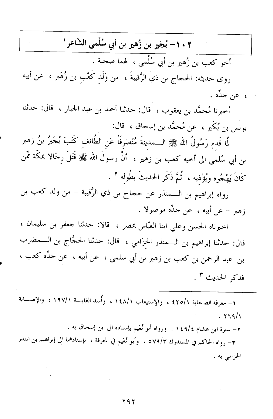 أخبرناه الحسن وعلي ابنا العباس بمصر، قالا: حدثنا جعفر بن سليمان، قال: حدثنا إبراهيم بن المنذر الحزامي، قال: حدثنا الحجاج بن المضرب، عن عبد الرحمن بن كعب بن زهير بن أبي سلمى، عن أبيه، عن جده كعب، فذكر الحديث.