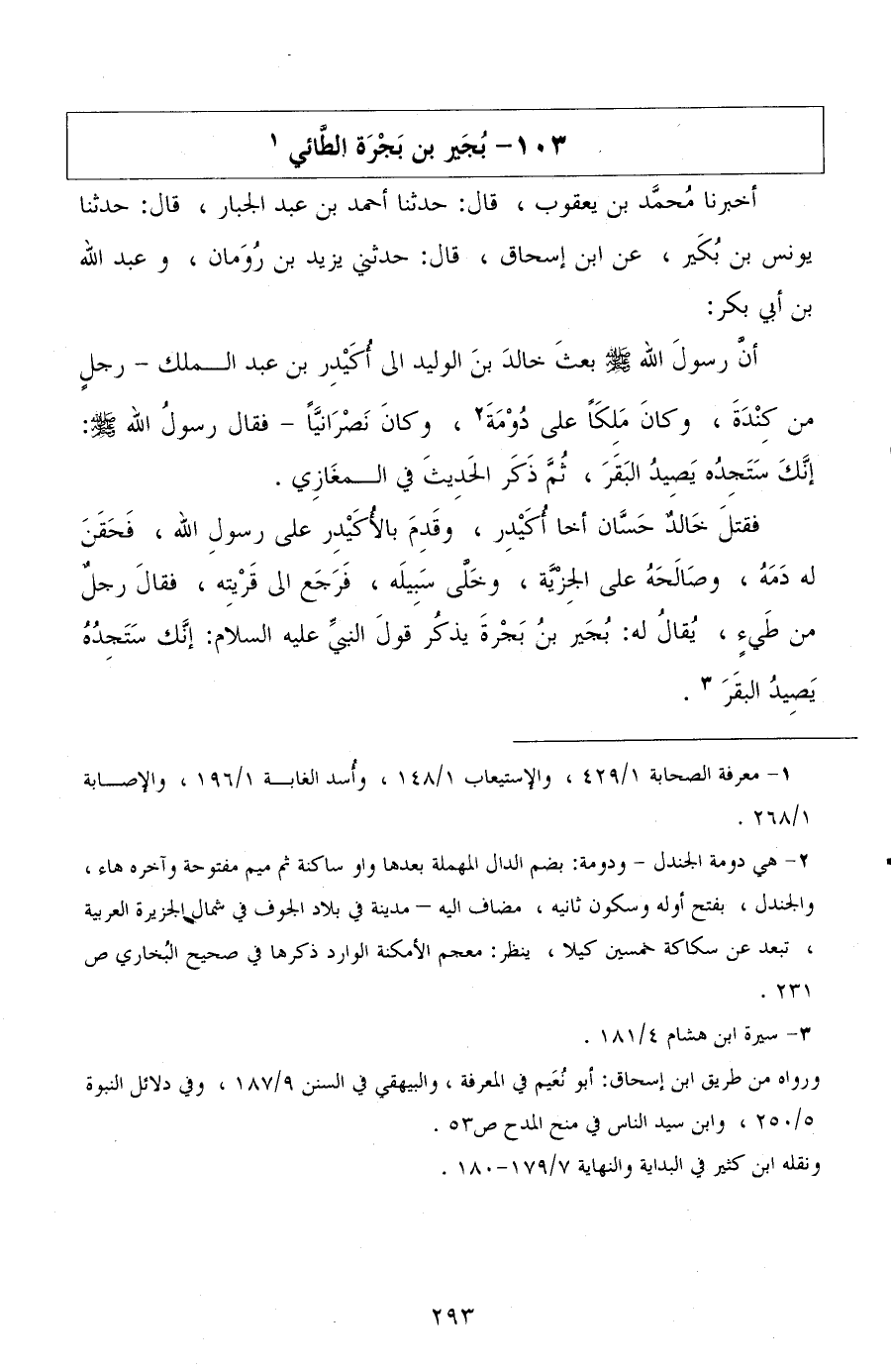 أخبرنا محمد بن يعقوب، قال: حدثنا أحمد بن عبد الجبار، قال: حدثنا يونس بن بكير، عن ابن إسحاق، قال: حدثني يزيد بن رومان، وعبد الله بن أبي بكر: أن رسول الله صلى الله عليه وسلم بعث خالد بن الوليد إلى أكيدر بن عبد الملك رجل من كندة، وكان ملكًا على دومة وكان نصرانيًا، فقال رسول الله صلى الله عليه وسلم: إنك ستجده يصيد البقر، ثم ذكر الحديث في المغازي.