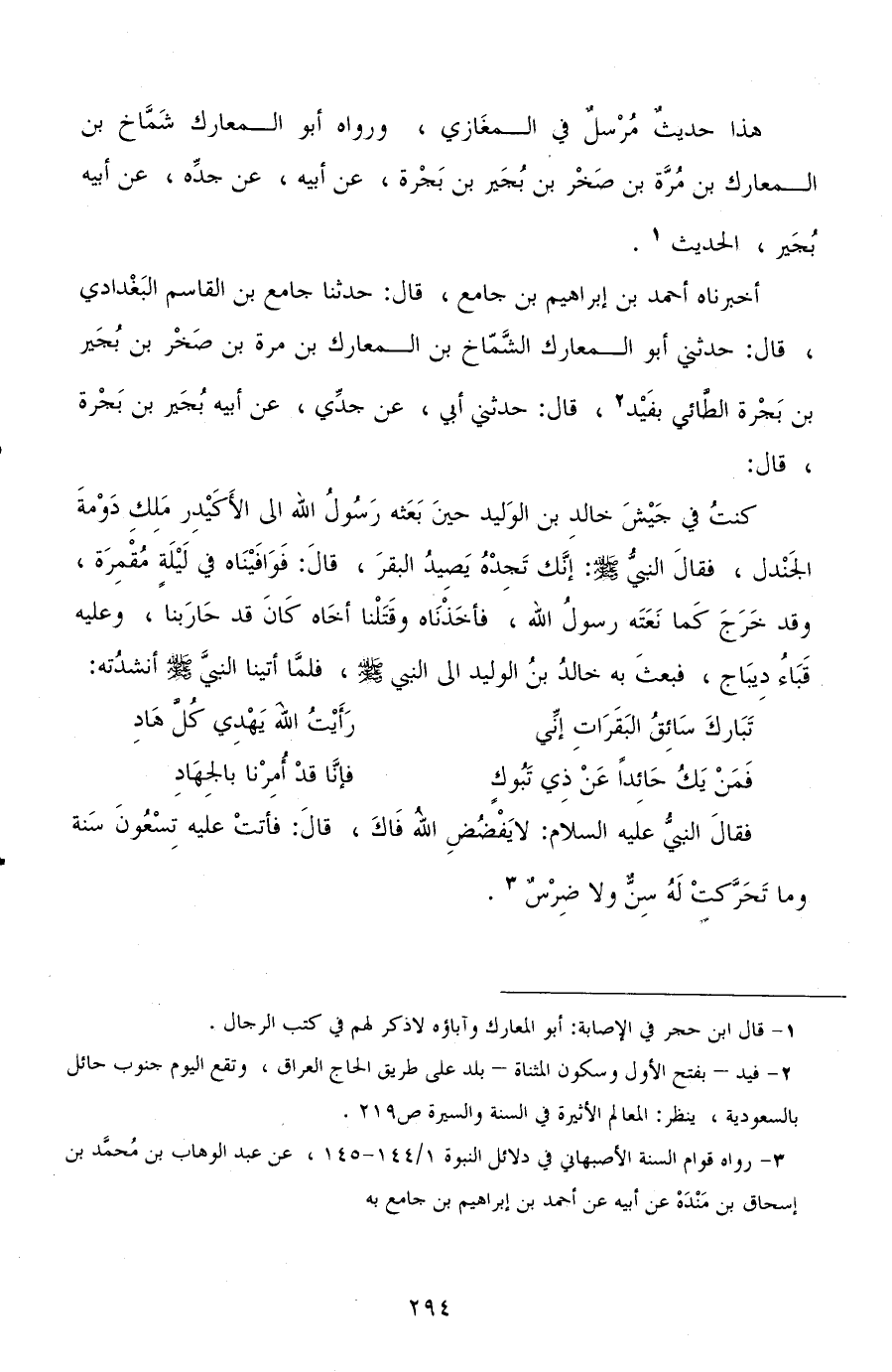 أخبرناه أحمد بن إبراهيم بن جامع، قال: حدثنا جامع بن القاسم البغدادي، قال: حدثني أبو المعارك الشماخ بن المعارك بن مرة بن صخر بن بجير بن بجرة الطائي بفيد، قال: حدثني أبي، عن جدي، عن أبيه بجير بن بجرة، قال: كنت في جيش خالد بن الوليد حين بعثه رسول الله إلى الأكيدر ملك دومة الجندل، فقال النبي صلى الله عليه وسلم: إنك تجده يصيد البقر، قال: فوافيناه في ليلة مقمرة، وقد خرج كما نعته رسول الله، فأخذناه وقتلنا أخاه كان قد حاربنا، وعليه قباء ديباج، فبعث به خالد بن الوليد إلى النبي صلى الله عليه وسلم، فلما أتينا النبي صلى الله عليه وسلم أنشدته: