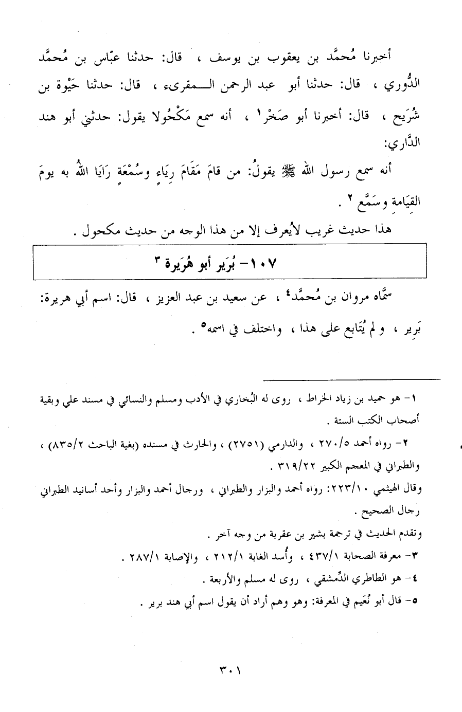 سماه مروان بن محمد، عن سعيد بن عبد العزيز، قال: اسم أبي هريرة: برير، ولم يتابع على هذا، واختلف في اسمه.