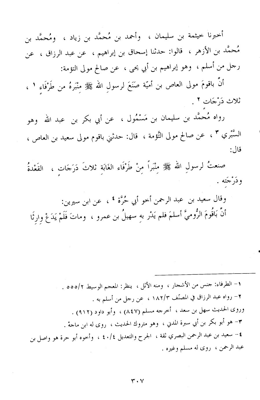 أخبرنا خيثمة بن سليمان، وأحمد بن محمد بن زياد، ومحمد بن محمد بن الأزهر، قالوا: حدثنا إسحاق بن إبراهيم، عن عبد الرزاق، عن رجل من أسلم، وهو إبراهيم بن أبي يحى، عن صالح مولى التؤمة: أن باقوم مولى العاص بن أمية صنع لرسول الله صلى الله عليه وسلم منبره من طرفاء، ثلاث درجات.