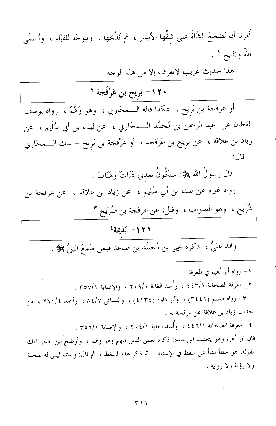 أو عرفجة بن بريح، هكذا قاله المحاربي، وهو وهم، رواه يوسف القطان عن عبد الرحمن بن محمد المحاربي، عن ليث بن أبي سليم، عن زياد بن علاقة، عن بريح بن عرفجة، أو عرفجة بن بريح شك المحاربي قال: قال رسول الله صلى الله عليه وسلم: ستكون بعدي هنات وهنات.