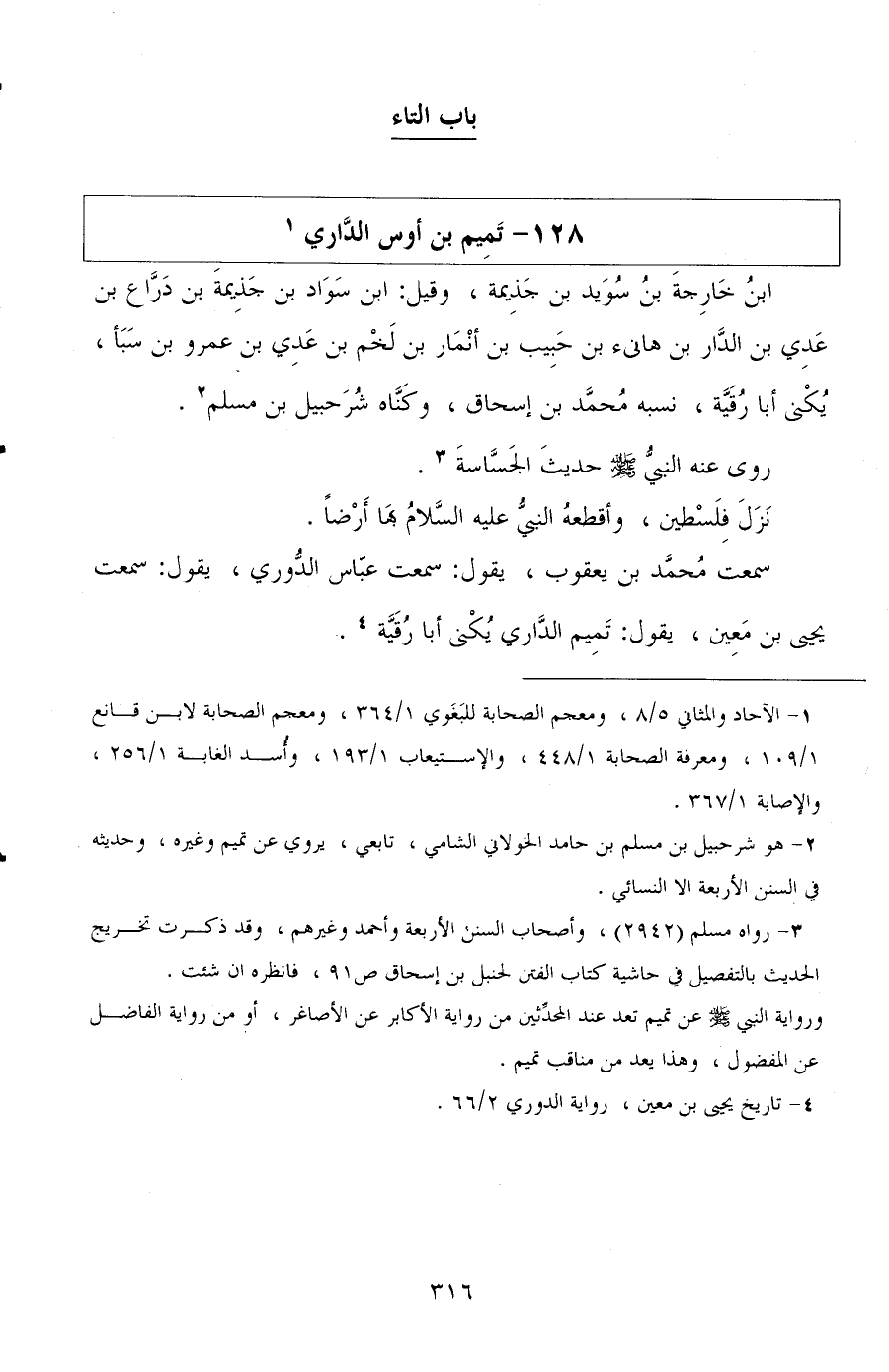 سمعت محمد بن يعقوب، يقول: سمعت عباس الدوري، يقول: سمعت يحيى بن معين، يقول: تميم الداري يكنى أبا رقية.