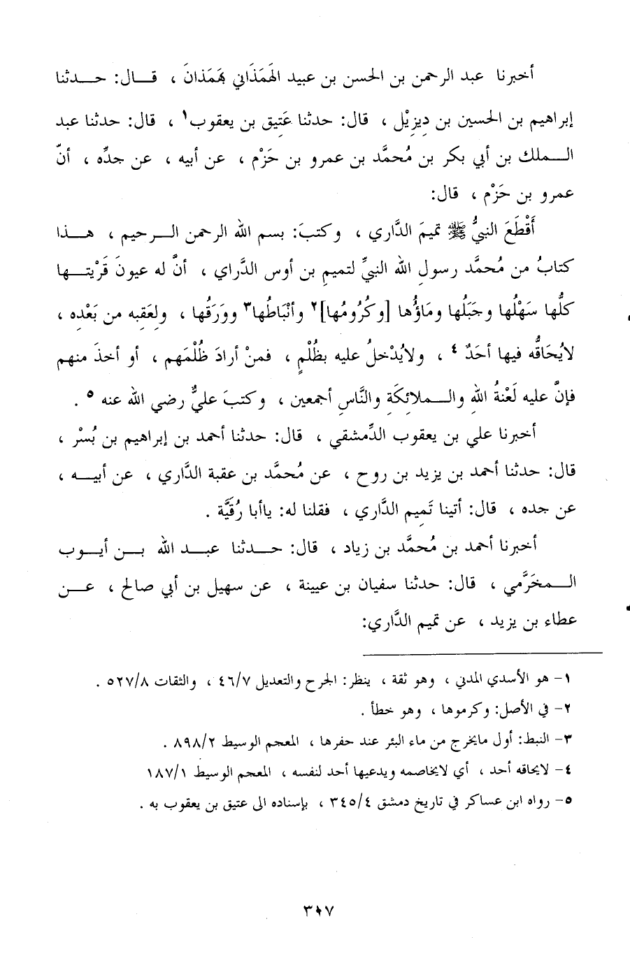 أخبرنا عبد الرحمن بن الحسن بن عبيد الهمذاني بهمذان، قال: حدثنا إبراهيم بن الحسين بن ديزيل، قال: حدثنا عتيق بن يعقوب، قال: حدثنا عبد الملك بن أبي بكر بن محمد بن عمرو بن حزم، عن أبيه، عن جده، أن عمرو بن حزم، قال: أقطع النبي صلى الله عليه وسلم تميم الداري، وكتب: بسم الله الرحمن الرحيم، هذا كتاب من محمد رسول الله النبي لتميم بن أوس الدراي، أن له عيون قريتها كلها سهلها وجبلها وماؤها وكرومها وأنباطها وورقها، ولعقبه من بعده، لا يحاقه فيها أحد، ولا يدخل عليه بظلم، فمن أراد ظلمهم، أو أخذ منهم فإن عليه لعنة الله والملائكة والناس أجمعين، وكتب علي رضي الله عنه.