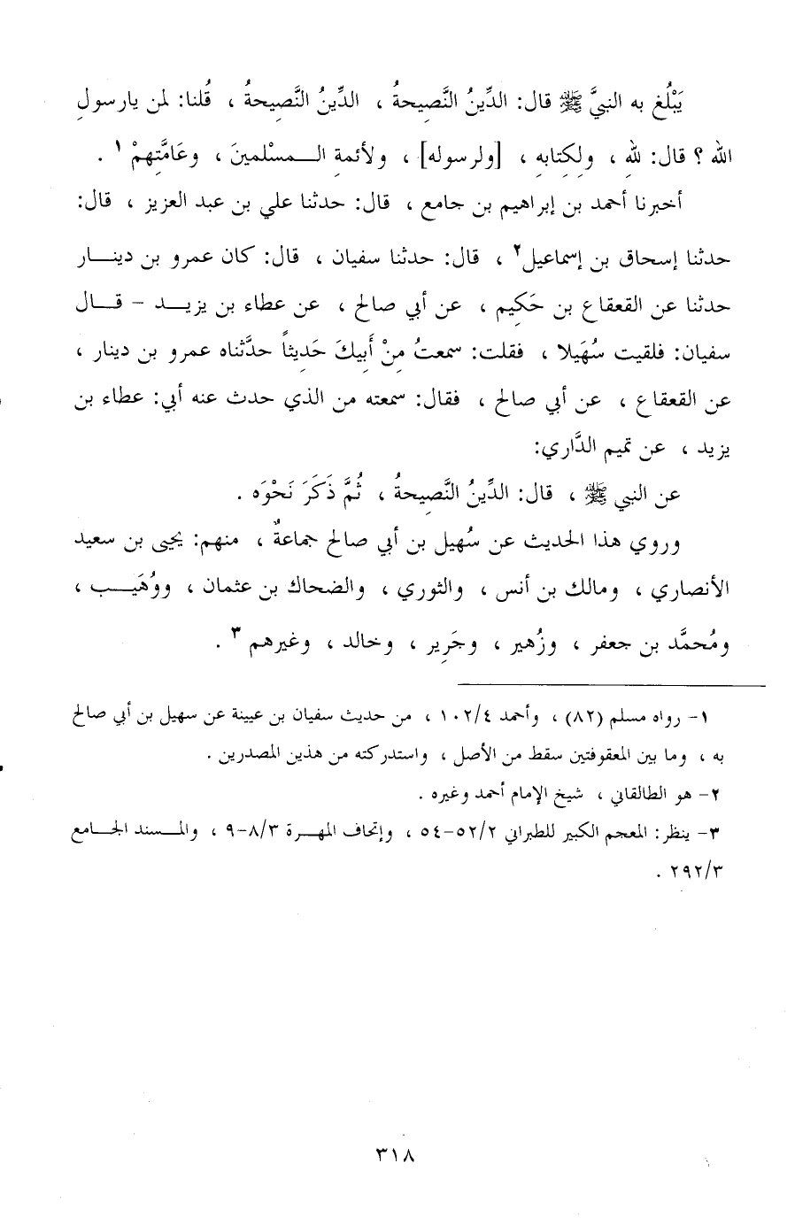 أخبرنا أحمد بن إبراهيم بن جامع، قال: حدثنا علي بن عبد العزيز، قال: حدثنا إسحاق بن إسماعيل، قال: حدثنا سفيان، قال: كان عمرو بن دينار، حدثنا عن القعقاع بن حكيم، عن أبي صالح، عن عطاء بن يزيد قال سفيان: فلقيت سهيلا، فقلت: سمعت من أبيك حديثًا حدثناه عمرو بن دينار، عن القعقاع، عن أبي صالح، فقال: سمعته من الذي حدث عنه أبي: عطاء بن يزيد، عن تميم الداري: عن النبي صلى الله عليه وسلم، قال: الدين النصيحة، ثم ذكر نحوه.