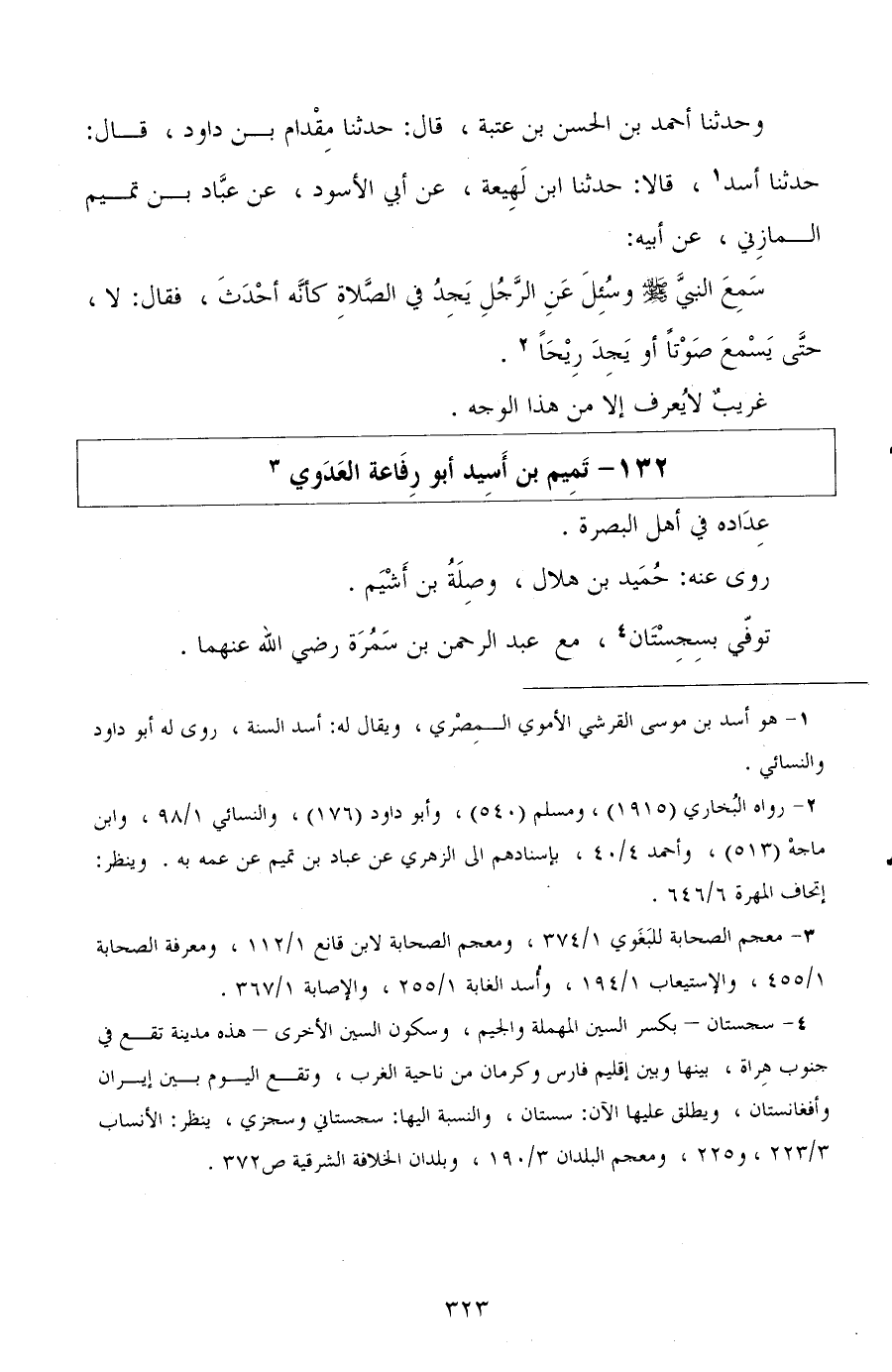 وحدثنا أحمد بن الحسن بن عتبة، قال: حدثنا مقدام بن داود، قال: حدثنا أسد، قالا: حدثنا ابن لهيعة، عن أبي الأسود، عن عباد بن تميم المازني، عن أبيه: سمع النبي صلى الله عليه وسلم وسئل عن الرجل يجد في الصلاة كأنه أحدث، فقال: لا، حتى يسمع صوتًا أو يجد ريحًا.