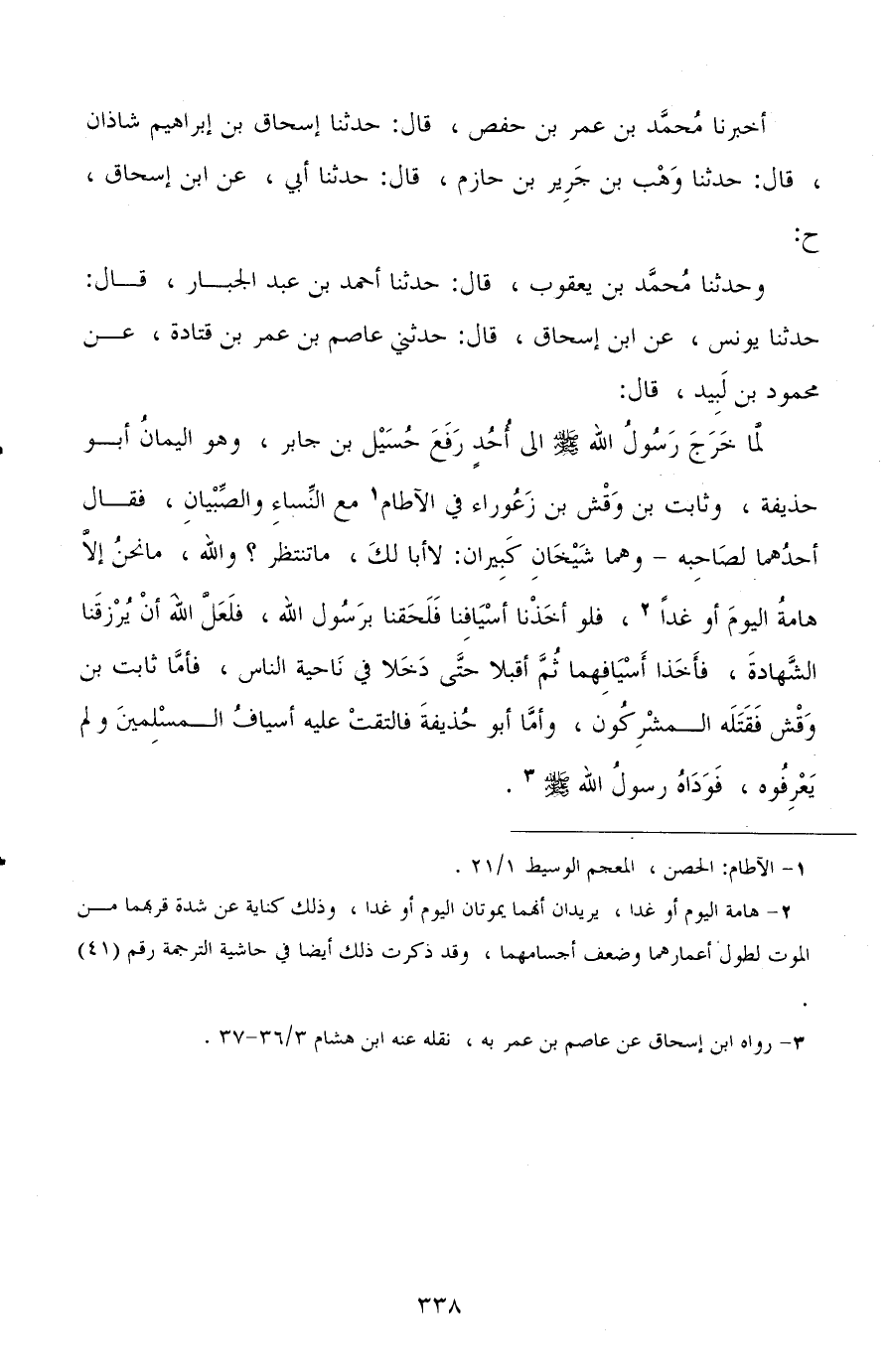 أخبرنا محمد بن عمر بن حفص، قال: حدثنا إسحاق بن إبراهيم شاذان، قال: حدثنا وهب بن جرير بن حازم، قال: حدثنا أبي، عن ابن إسحاق، ح: وحدثنا محمد بن يعقوب، قال: حدثنا أحمد بن عبد الجبار، قال: حدثنا يونس، عن ابن إسحاق، قال: حدثني عاصم بن عمر بن قتادة، عن محمود بن لبيد، قال: لما خرج رسول الله صلى الله عليه وسلم إلى أحد رفع حسيل بن جابر، وهو اليمان أبو حذيفة، وثابت بن وقش بن زعوراء في الآطام مع النساء والصبيان، فقال أحدهما لصاحبه وهما شيخان كبيران: لا أبا لك ما تنتظر؟ والله، ما نحن إلا هامة اليوم أو غدًا، فلو أخذنا أسيافنا فلحقنا برسول الله، فلعل الله أن يرزقنا الشهادة، فأخذا أسيافهما ثم أقبلا حتى دخلا في ناحية الناس، فأما ثابت بن وقش فقتله المشركون، وأما أبو حذيفة فالتقت عليه أسياف المسلمين ولم يعرفوه، فوداه رسول الله صلى الله عليه وسلم.