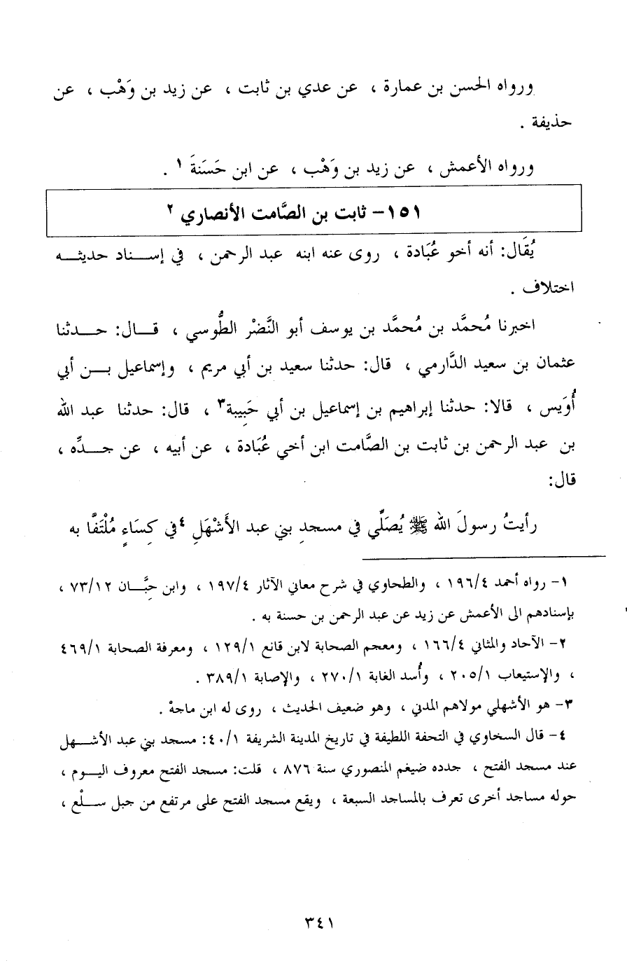أخبرنا محمد بن محمد بن يوسف أبو النضر الطوسي، قال: حدثنا عثمان بن سعيد الدارمي، قال: حدثنا سعيد بن أبي مريم، وإسماعيل بن أبي أويس، قالا: حدثنا إبراهيم بن إسماعيل بن أبي حبيبة، قال: حدثنا عبد الله بن عبد الرحمن بن ثابت بن الصامت ابن أخي عبادة، عن أبيه، عن جده، قال: رأيت رسول الله صلى الله عليه وسلم يصلي في مسجد بني عبد الأشهل في كساء ملتفًا به،