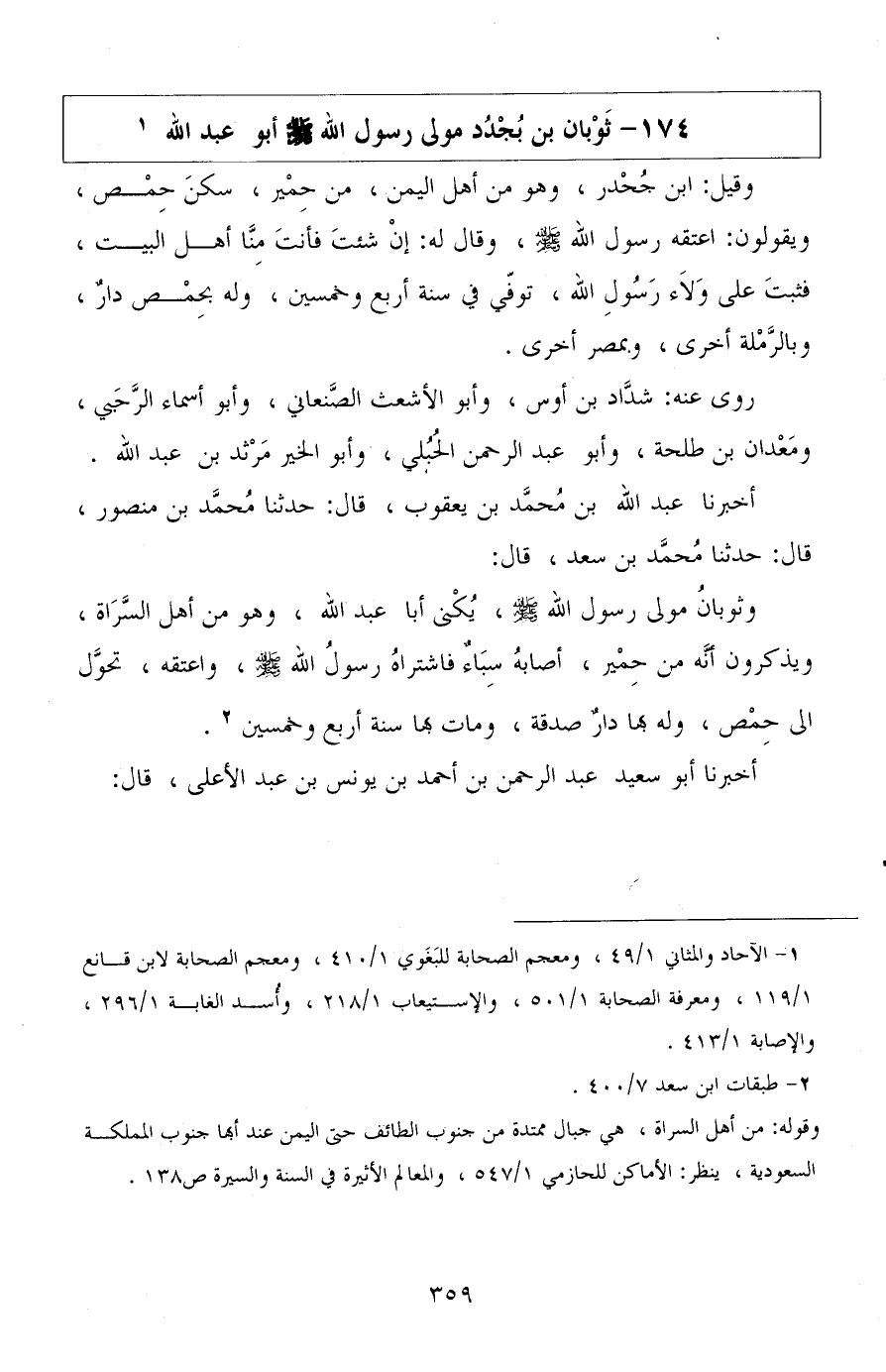 أخبرنا عبد الله بن محمد بن يعقوب، قال: حدثنا محمد بن منصور، قال: حدثنا محمد بن سعد، قال: وثوبان مولى رسول الله صلى الله عليه وسلم يكنى أبا عبد الله، وهو من أهل السراة، ويذكرون أنه من حمير، أصابه سباء فاشتراه رسول الله صلى الله عليه وسلم واعتقه، تحول إلى حمص وله بها دار صدقة، ومات بها سنة أربع وخمسين.