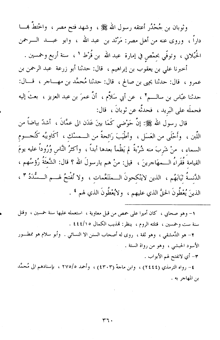 أخبرنا علي بن يعقوب بن إبراهيم، قال: حدثنا أبو زرعة عبد الرحمن بن عمرو، قال: حدثنا يحيى بن صالح، قال: حدثنا محمد بن مهاجر، قال: حدثنا عباس بن سالم، عن أبي سلام، أن عمر بن عبد العزيز بعث إليه فحمله على البريد فحدثه عن ثوبان، قال: قال رسول الله صلى الله عليه وسلم: إن حوضي كما بين عدن إلى عمان، أشد بياضًا من اللبن، وأحلى من العسل، وأطيب رائحة من المسك، أكاويبه كنجوم السماء، من شرب منه شربة لم يظمأ بعدها أبدًا، وأكثر الناس ورودًا عليه يوم القيامة فقراء المهاجرين، قيل: من هم يا رسول الله؟ قال: الشعثة رءوسهم، الدنسة ثيابهم، الذين لا ينكحون المتنعمات، ولا تفتح لهم السدد، الذين يعطون الحق الذي عليهم، ولا يعطون الذي لهم.