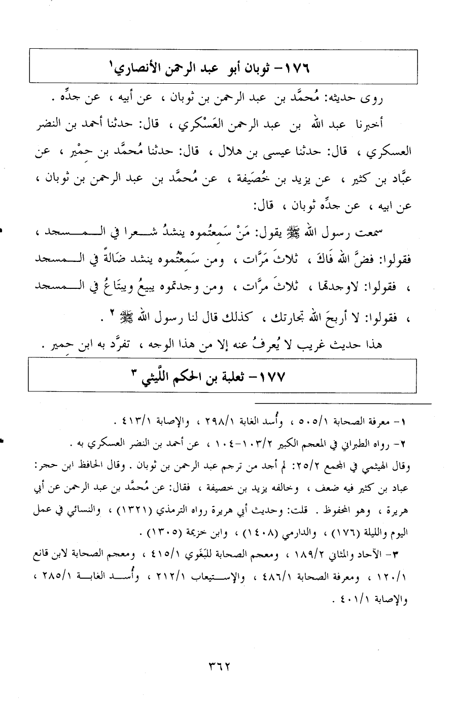 أخبرنا عبد الله بن عبد الرحمن العسكري، قال: حدثنا أحمد بن النضر العسكري، قال: حدثنا عيسى بن هلال، قال: حدثنا محمد بن حمير، عن عباد بن كثير، عن يزيد بن خصيفة، عن محمد بن عبد الرحمن بن ثوبان، عن أبيه، عن جده ثوبان، قال: سمعت رسول الله صلى الله عليه وسلم يقول: من سمعتموه ينشد شعرا في المسجد فقولوا: فض الله فاك ثلاث مرات، ومن سمعتموه ينشد ضالة في المسجد فقولوا: لا وجدتها ثلاث مرات، ومن وجدتموه يبيع ويبتاع في المسجد فقولوا: لا أربح الله تجارتك، كذلك قال لنا رسول الله صلى الله عليه وسلم.