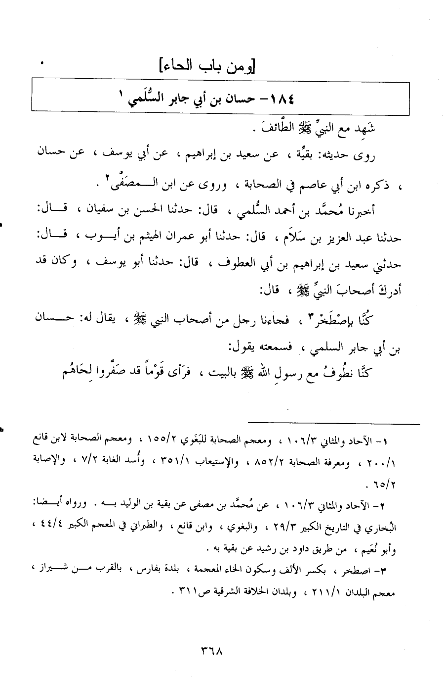 أخبرنا محمد بن أحمد السلمي، قال: حدثنا الحسن بن سفيان، قال: حدثنا عبد العزيز بن سلام، قال: حدثنا أبو عمران الهيثم بن أيوب، قال: حدثني سعيد بن إبراهيم بن أبي العطوف، قال: حدثنا أبو يوسف، وكان قد أدرك أصحاب النبي صلى الله عليه وسلم، قال: كنا بإصطخر، فجاءنا رجل من أصحاب النبي صلى الله عليه وسلم، يقال له: حسان بن أبي جابر السلمي، فسمعته يقول: كنا نطوف مع رسول الله صلى الله عليه وسلم بالبيت، فرأى قومًا قد صفروا لحاهم