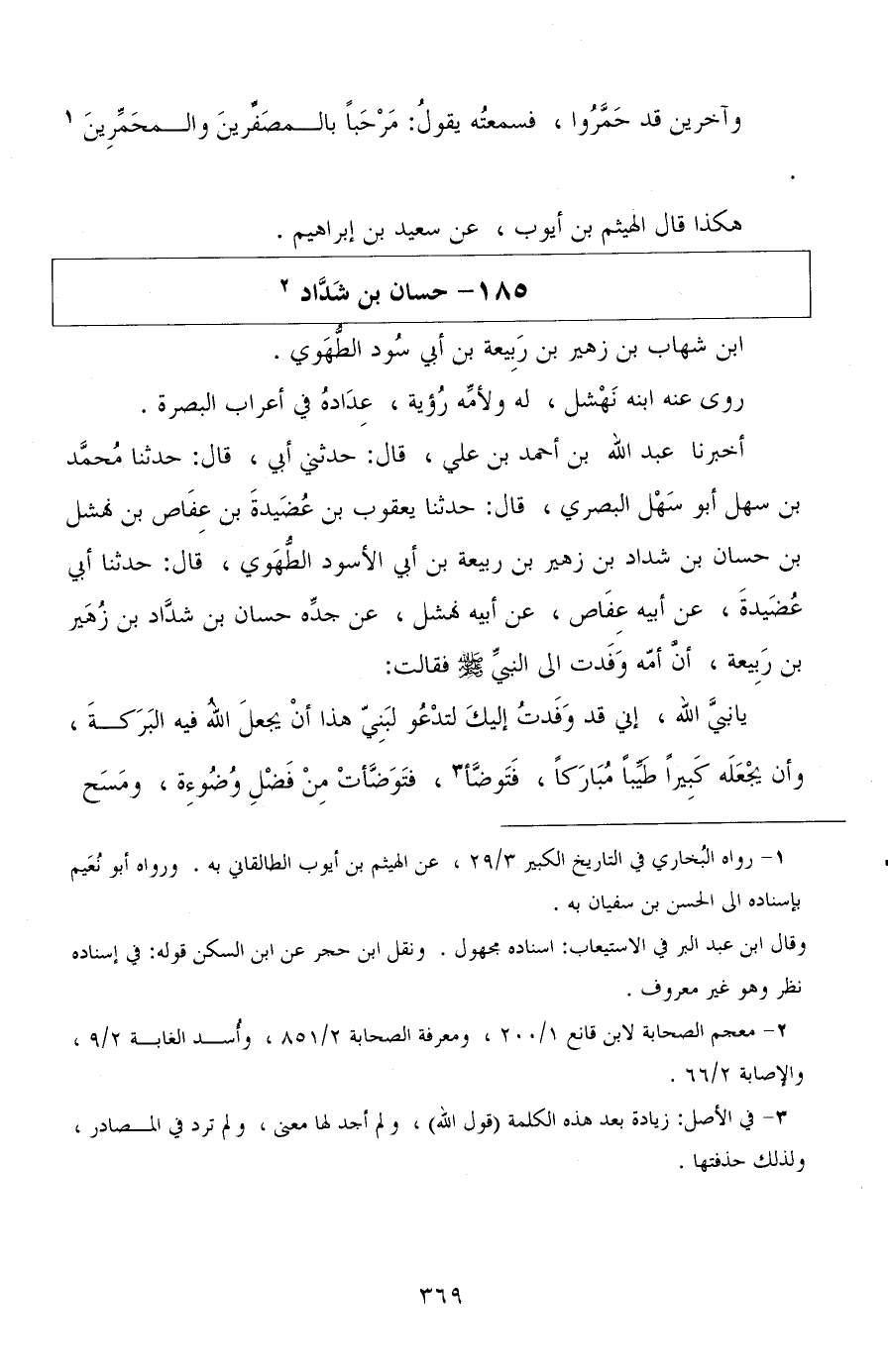أخبرنا عبد الله بن أحمد بن علي، قال: حدثني أبي، قال: حدثنا محمد بن سهل أبو سهل البصري، قال: حدثنا يعقوب بن عضيدة بن عفاص بن نهشل بن حسان بن شداد بن زهير بن ربيعة بن أبي الأسود الطهوي، قال: حدثنا أبي عضيدة، عن أبيه عفاص، عن أبيه نهشل، عن جده حسان بن شداد بن زهير بن ربيعة، أن أمه وفدت إلى النبي صلى الله عليه وسلم فقالت: يا نبي الله، إني قد وفدت إليك لتدعو لبني هذا أن يجعل الله فيه البركة، وأن يجعله كبيرًا طيبًا مباركًا، فتوضأ فتوضأت من فضل وضوئه، ومسح