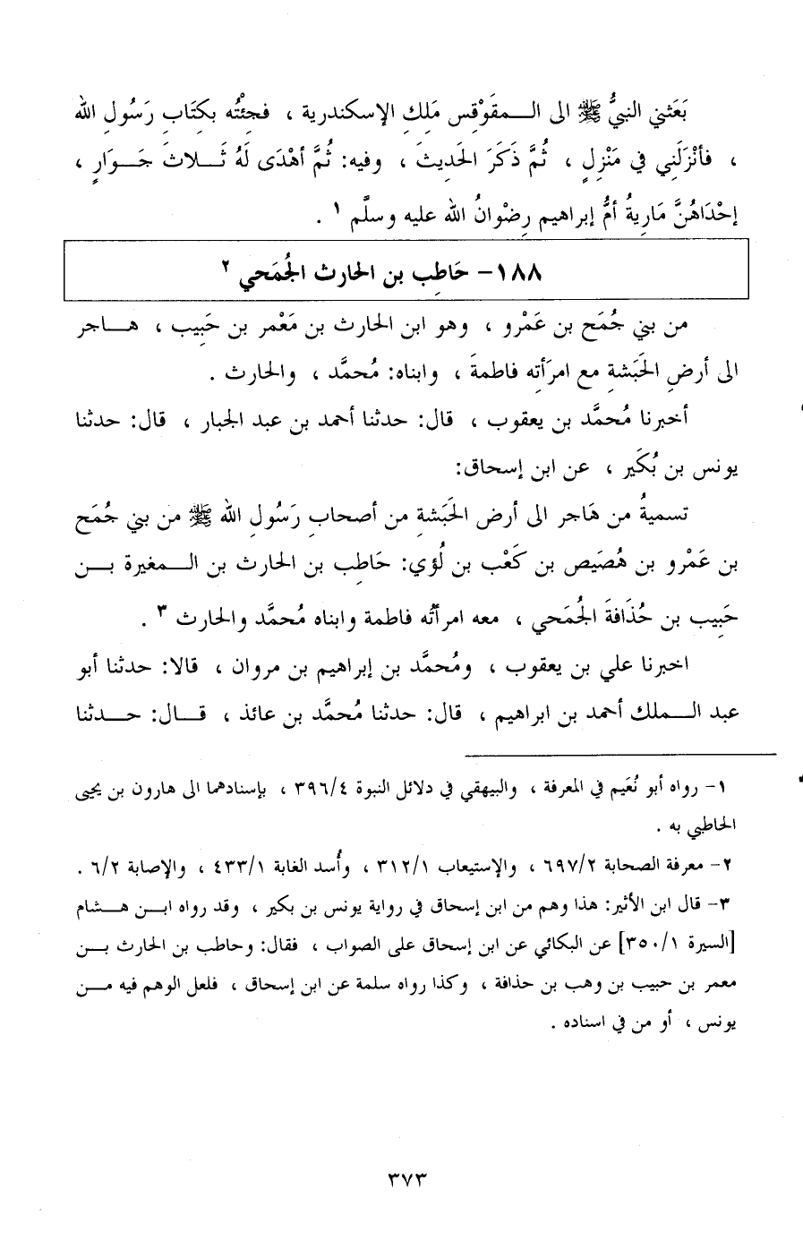 أخبرنا محمد بن يعقوب، قال: حدثنا أحمد بن عبد الجبار، قال: حدثنا يونس بن بكير، عن ابن إسحاق: تسمية من هاجر إلى أرض الحبشة من أصحاب رسول الله صلى الله عليه وسلم من بني جمح بن عمرو بن هصيص بن كعب بن لؤي: حاطب بن الحارث بن المغيرة بن حبيب بن حذافة الجمحي، معه امرأته فاطمة وابناه محمد والحارث.