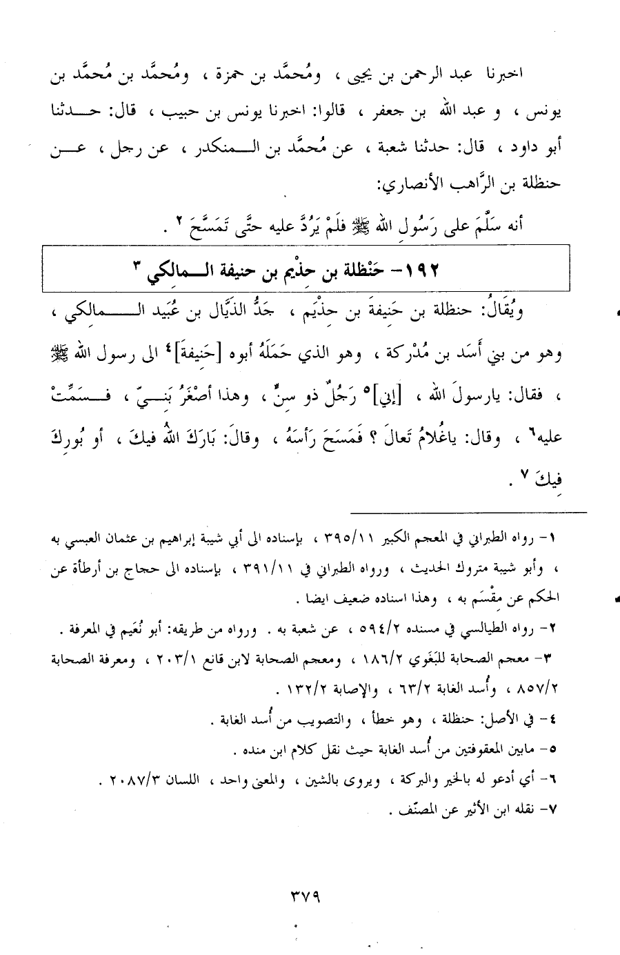 أخبرنا عبد الرحمن بن يحيى، ومحمد بن حمزة، ومحمد بن محمد بن يونس، وعبد الله بن جعفر، قالوا: أخبرنا يونس بن حبيب، قال: حدثنا أبو داود، قال: حدثنا شعبة، عن محمد بن المنكدر، عن رجل، عن حنظلة بن الراهب الأنصاري: أنه سلم على رسول الله صلى الله عليه وسلم فلم يرد عليه حتى تمسح.