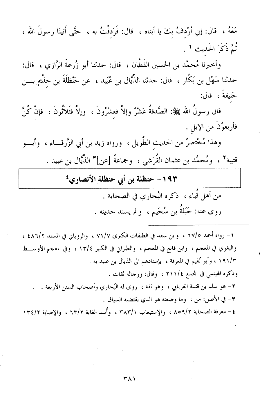 وأخبرنا محمد بن الحسين القطان، قال: حدثنا أبو زرعة الرازي، قال: حدثنا سهل بن بكار، قال: حدثنا الذيال بن عبيد، عن حنظلة بن حذيم بن حنيفة، قال: قال رسول الله صلى الله عليه وسلم: الصدقة عشر وإلا فعشرون، وإلا فثلاثون، فإن كن فأربعون من الإبل.