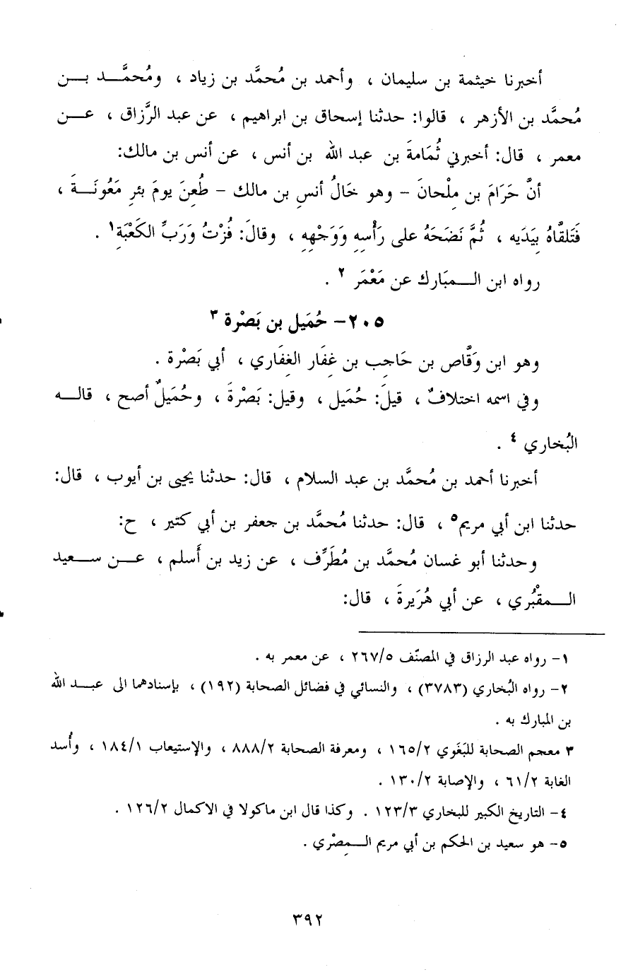 أخبرنا خيثمة بن سليمان، وأحمد بن محمد بن زياد، ومحمد بن محمد بن الأزهر، قالوا: حدثنا إسحاق بن إبراهيم، عن عبد الرزاق، عن معمر، قال: أخبرني ثمامة بن عبد الله بن أنس، عن أنس بن مالك: أن حرام بن ملحان وهو خال أنس بن مالك طعن يوم بئر معونة، فتلقاه بيديه، ثم نضحه على رأسه ووجهه، وقال: فزت ورب الكعبة.