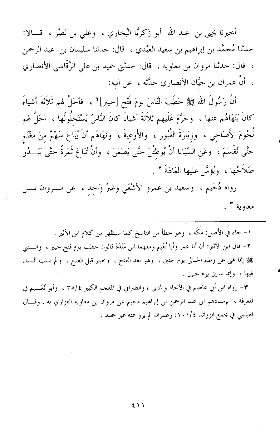 أخبرنا يحيى بن عبد الله أبو زكريا البخاري، وعلي بن نصر، قالا: حدثنا محمد بن إبراهيم بن سعيد العبدي، قال: حدثنا سليمان بن عبد الرحمن، قال: حدثنا مروان بن معاوية، قال: حدثني حميد علي الرقاشي الأنصاري، أن عمران بن حيان الأنصاري حدثه، عن أبيه: أن رسول الله صلى الله عليه وسلم خطب الناس يوم فتح خيبر، فأحل لهم ثلاثة أشياء كان ينهاهم عنها، وحرم عليهم ثلاثة أشياء كان الناس يستحلونها، أحل لهم لحوم الأضاحي، وزيارة القبور، والأوعية، ونهاهم أن يباع سهم من مغنم حتى تقسم، وعن السبايا أن يوطئن حتى يضعن، وأن تباع ثمرة حتى يبدو صلاحها ويؤمن عليها العاهة.