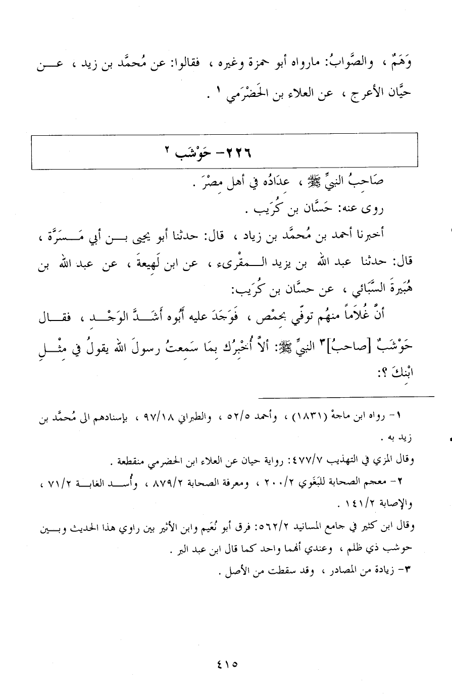 أخبرنا أحمد بن محمد بن زياد، قال: حدثنا أبو يحيى بن أبي مسرة، قال: حدثنا عبد الله بن يزيد المقرئ، عن ابن لهيعة، عن عبد الله بن هبيرة السبائي، عن حسان بن كريب: أن غلامًا منهم توفي بحمص، فوجد عليه أبوه أشد الوجد، فقال حوشب صاحب النبي صلى الله عليه وسلم: ألا أخبرك بما سمعت رسول الله يقول في مثل ابنك؟ !