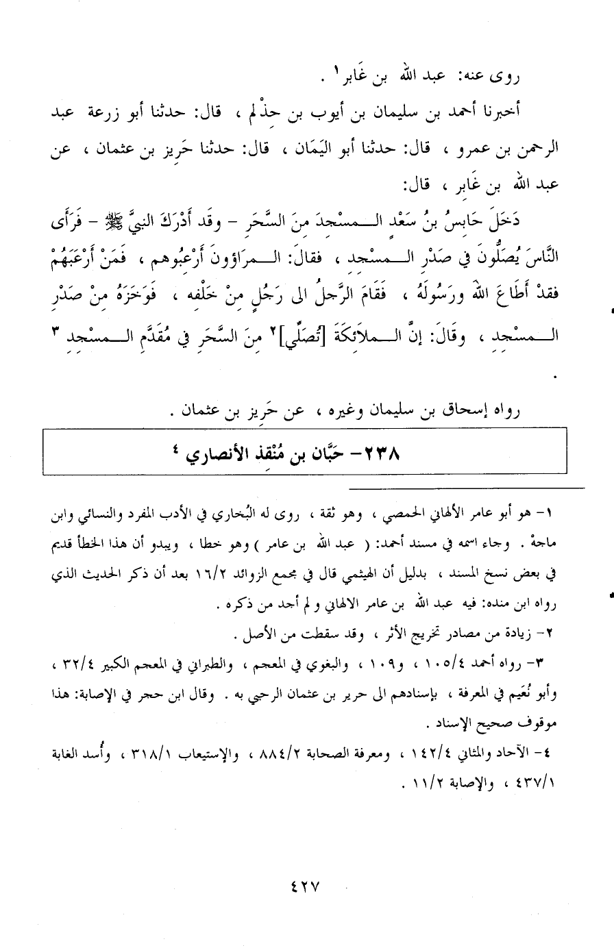 أخبرنا أحمد بن سليمان بن أيوب بن حذلم، قال: حدثنا أبو زرعة عبد الرحمن بن عمرو، قال: حدثنا أبو اليمان، قال: حدثنا حريز بن عثمان، عن عبد الله بن غابر، قال: دخل حابس بن سعد المسجد من السحر وقد أدرك النبي صلى الله عليه وسلم، فرأى الناس يصلون في صدر المسجد، فقال: المراءون أرعبوهم، فمن أرعبهم فقد أطاع الله ورسوله، فقام الرجل إلى رجل من خلفه، فوخزه من صدر المسجد، وقال: إن الملائكة تصلي من السحر في مقدم المسجد.