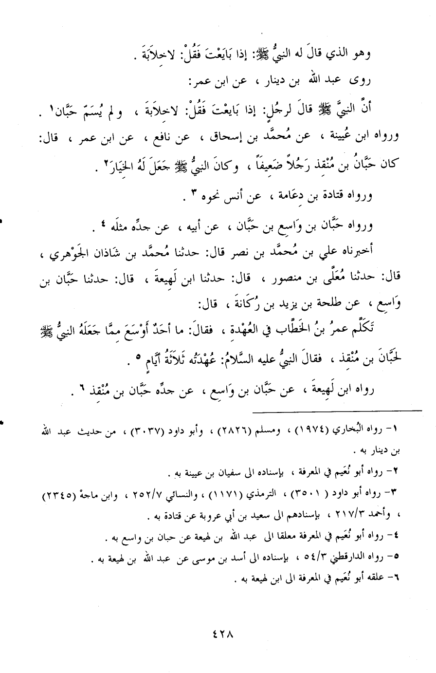 أخبرناه علي بن محمد بن نصر قال: حدثنا محمد بن شاذان الجوهري، قال: حدثنا معلى بن منصور، قال: حدثنا ابن لهيعة، قال: حدثنا حبان بن واسع، عن طلحة بن يزيد بن ركانة، قال: تكلم عمر بن الخطاب في العهدة، فقال: ما أحد أوسع مما جعله النبي صلى الله عليه وسلم لحبان بن منقذ، فقال النبي عليه السلام: عهدته ثلاثة أيام.
