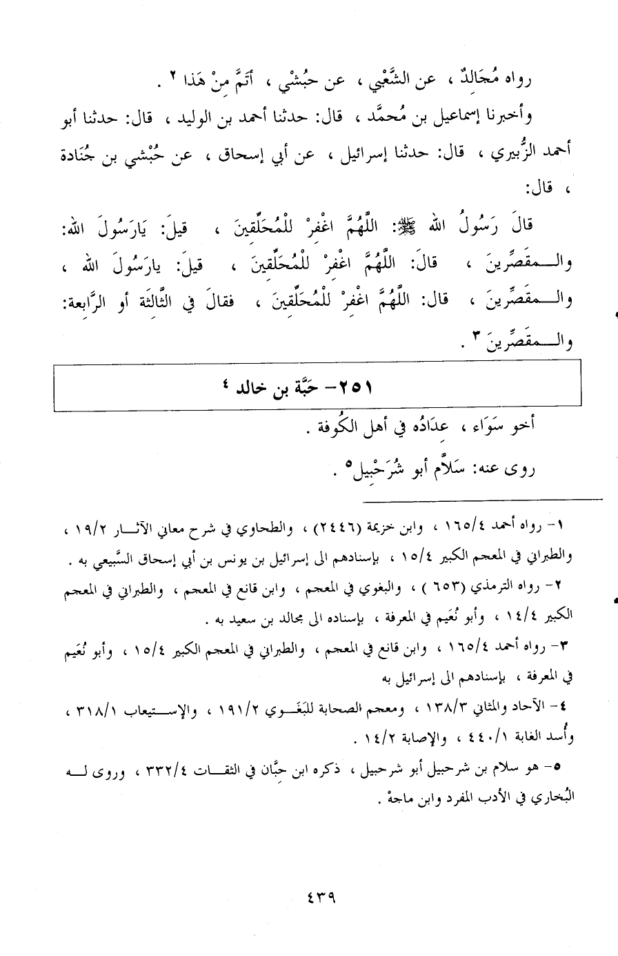 وأخبرنا إسماعيل بن محمد، قال: حدثنا أحمد بن الوليد، قال: حدثنا أبو أحمد الزبيري، قال: حدثنا إسرائيل، عن أبي إسحاق، عن حبشي بن جنادة، قال: قال رسول الله صلى الله عليه وسلم: اللهم اغفر للمحلقين، قيل: يا رسول الله: والمقصرين، قال: اللهم اغفر للمحلقين، قيل: يا رسول الله، والمقصرين، قال: اللهم اغفر للمحلقين، فقال في الثالثة أو الرابعة: والمقصرين.
