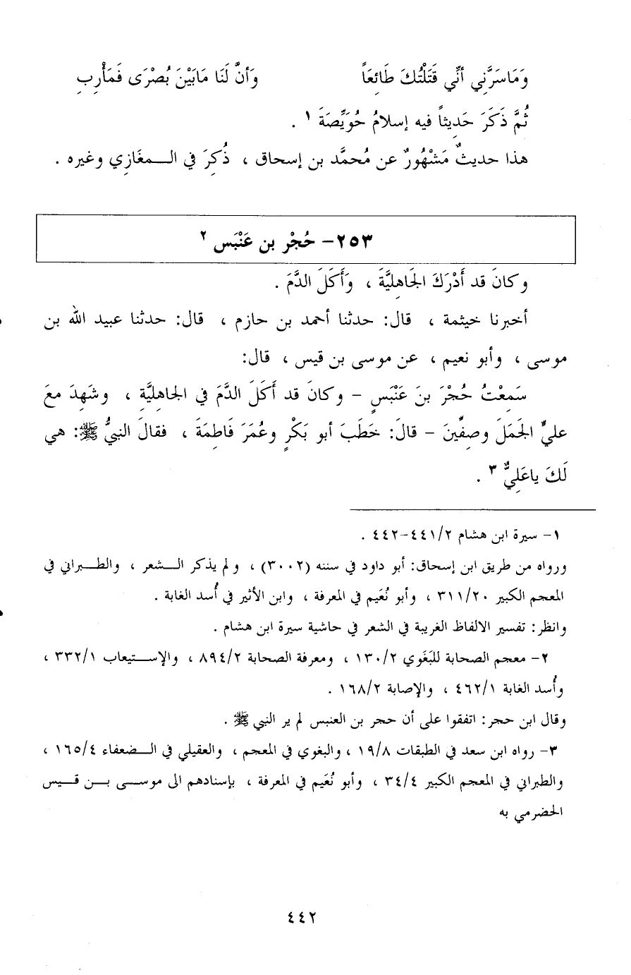 أخبرنا خيثمة، قال: حدثنا أحمد بن حازم، قال: حدثنا عبيد الله بن موسى، وأبو نعيم، عن موسى بن قيس، قال: سمعت حجر بن عنبس وكان قد أكل الدم في الجاهلية وشهد مع علي الجمل وصفين قال: خطب أبو بكر وعمر فاطمة، فقال النبي صلى الله عليه وسلم: هي لك يا علي.