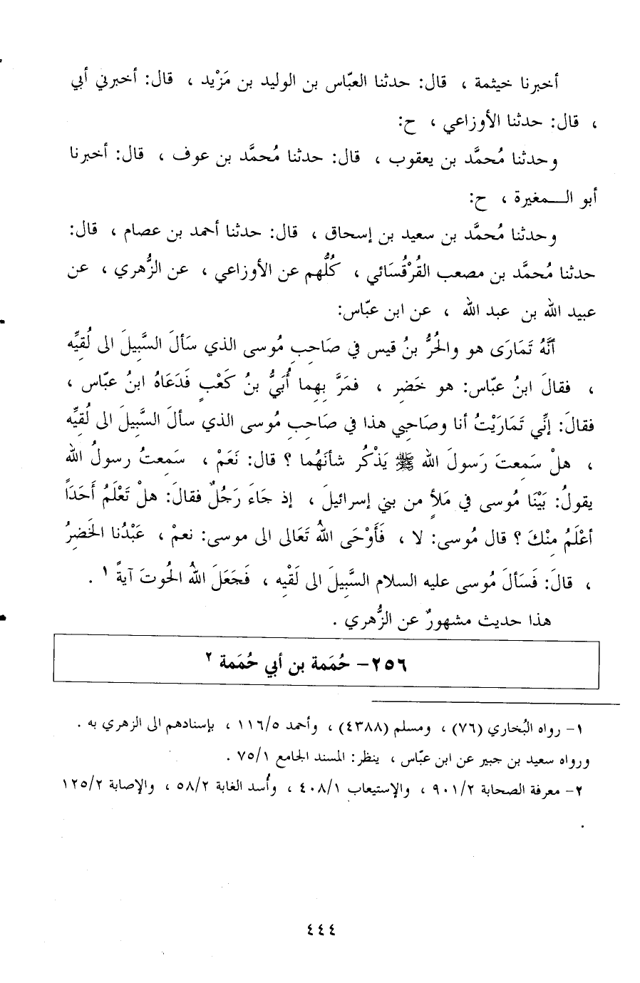 أخبرنا خيثمة، قال: حدثنا العباس بن الوليد بن مزيد، قال: أخبرني أبي، قال: حدثنا الأوزاعي، ح: وحدثنا محمد بن يعقوب، قال: حدثنا محمد بن عوف، قال: أخبرنا أبو المغيرة، ح: وحدثنا محمد بن سعيد بن إسحاق، قال: حدثنا أحمد بن عصام، قال: حدثنا محمد بن مصعب القرقسائي، كلهم عن الأوزاعي، عن الزهري، عن عبيد الله بن عبد الله، عن ابن عباس: أنه تمارى هو والحر بن قيس في صاحب موسى الذي سأل السبيل إلى لقيه، فقال ابن عباس: هو خضر، فمر بهما أبي بن كعب فدعاه ابن عباس، فقال: إني تماريت أنا وصاحبي هذا في صاحب موسى الذي سأل السبيل إلى لقيه، هل سمعت رسول الله صلى الله عليه وسلم يذكر شأنهما؟ قال: نعم، سمعت رسول الله يقول: بينا موسى في ملأ من بني إسرائيل، إذ جاء رجل فقال: هل تعلم أحدًا أعلم منك؟ قال موسى: لا، فأوحى الله تعالى إلى موسى: نعم، عبدنا الخضر، قال: فسأل موسى عليه السلام السبيل إلى لقيه، فجعل الله الحوت آية.