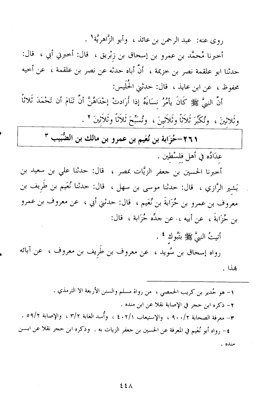 أخبرنا الحسين بن جعفر الزيات بمصر، قال: حدثنا علي بن سعيد بن بشير الرازي، قال: حدثنا موسى بن سهل، قال: حدثنا نعيم بن طريف بن معروف بن عمرو بن حزابة بن نعيم، قال: حدثني أبي، عن معروف بن عمرو بن حزابة، عن أبيه، عن جده حزابة، قال: أتيت النبي صلى الله عليه وسلم بتبوك.