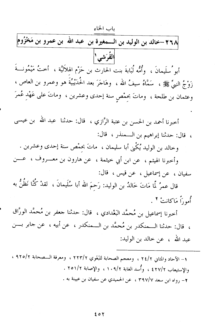 أخبرنا أحمد بن الحسن بن عتبة الرازي، قال: حدثنا عبد الله بن عيسى، قال: حدثنا إبراهيم بن المنذر، قال: وخالد بن الوليد