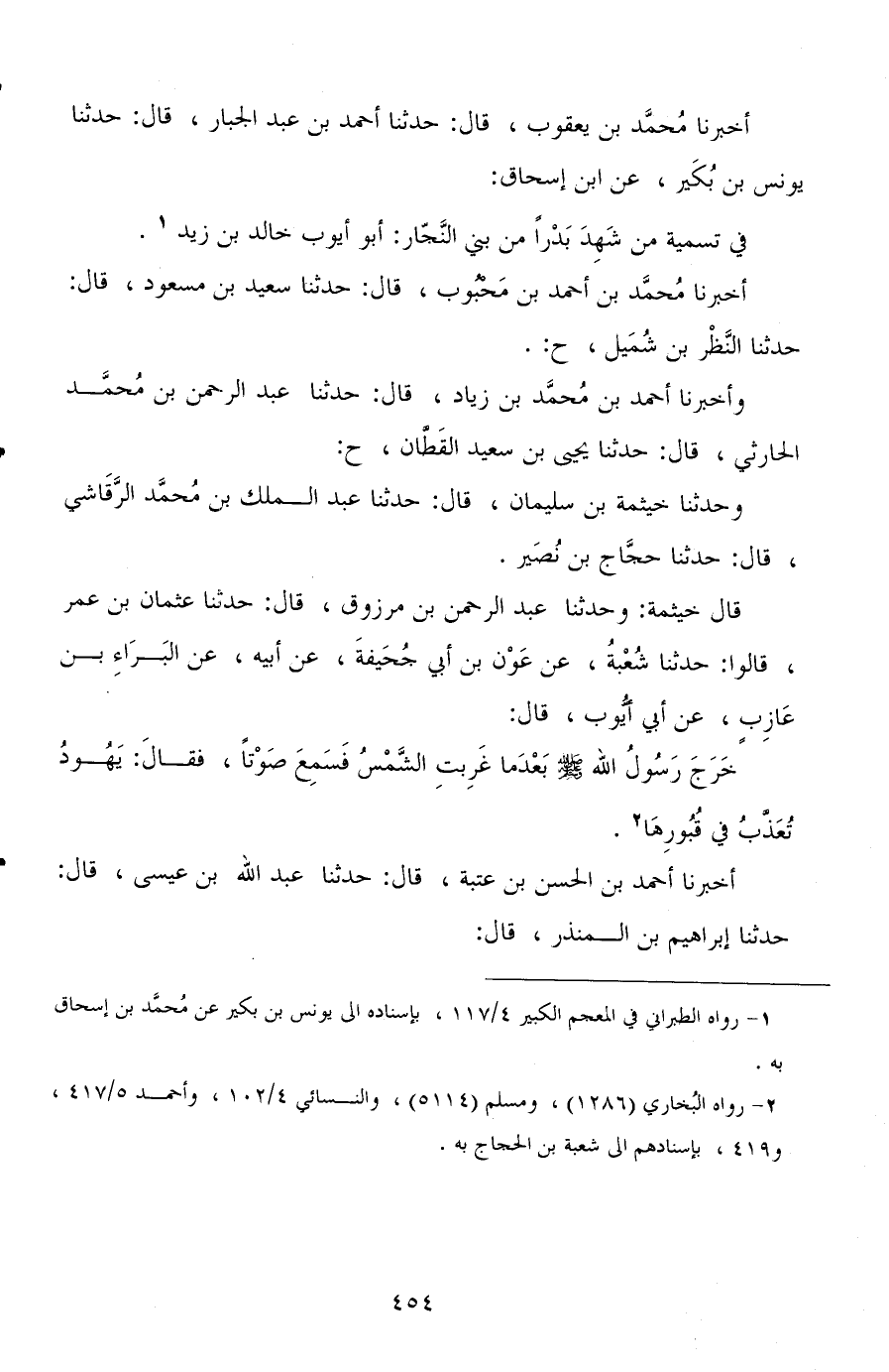 قال خيثمة: وحدثنا عبد الرحمن بن مرزوق، قال: حدثنا عثمان بن عمر، قالوا: حدثنا شعبة، عن عون بن أبي جحيفة، عن أبيه، عن البراء بن عازب، عن أبي أيوب، قال: خرج رسول الله صلى الله عليه وسلم بعدما غربت الشمس فسمع صوتًا، فقال: يهود تعذب في قبورها.