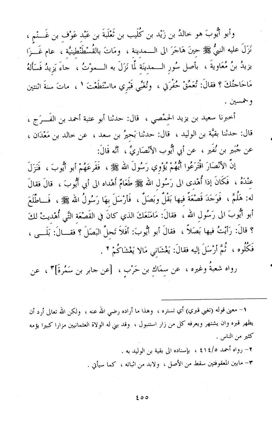 وأبو أيوب هو خالد بن زيد بن كليب بن ثعلبة بن عبد عوف بن غنم، نزل عليه النبي صلى الله عليه وسلم حين هاجر إلى المدينة، ومات بالقسطنطينية عام غزا يزيد بن معاوية بأصل سور المدينة لما نزل به الموت، جاء يزيد فسأله ما حاجتك؟ فقال: تعمق حفرتي وتغبي قبري ما استطعت، مات سنة اثنتين وخمسين.