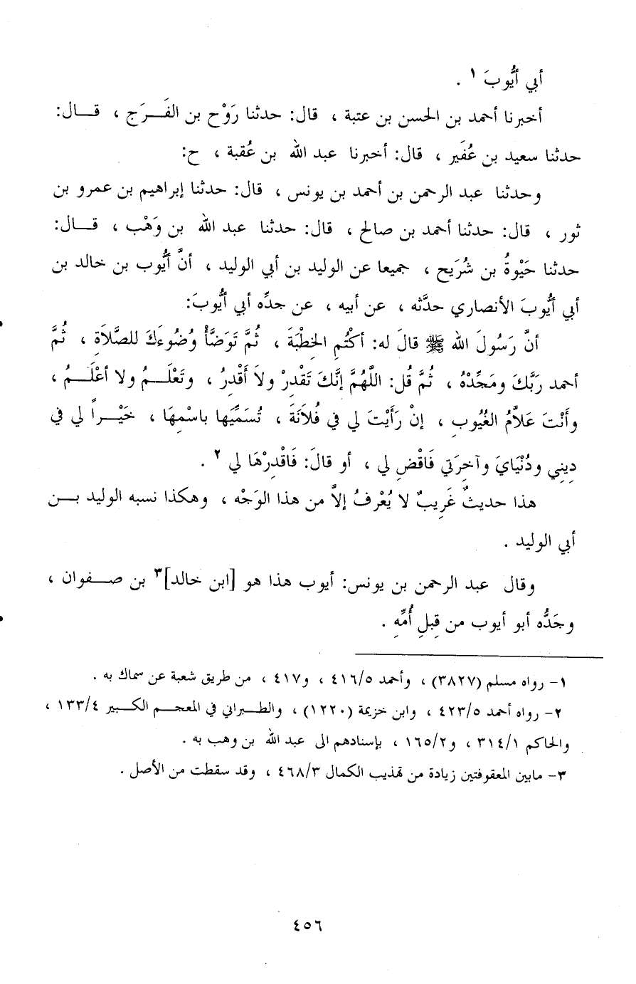أخبرنا أحمد بن الحسن بن عتبة، قال: حدثنا روح بن الفرج، قال: حدثنا سعيد بن عفير، قال: أخبرنا عبد الله بن عقبة، ح: وحدثنا عبد الرحمن بن أحمد بن يونس، قال: حدثنا إبراهيم بن عمرو بن ثور، قال: حدثنا أحمد بن صالح، قال: حدثنا عبد الله بن وهب، قال: حدثنا حيوة بن شريح، جميعا عن الوليد بن أبي الوليد، أن أيوب بن خالد بن أبي أيوب الأنصاري حدثه، عن أبيه، عن جده أبي أيوب: أن رسول الله صلى الله عليه وسلم قال له: أكتم الخطبة، ثم توضأ وضوءك للصلاة، ثم أحمد ربك ومجده، ثم قل: اللهم إنك تقدر ولا أقدر، وتعلم ولا أعلم، وأنت علام الغيوب، إن رأيت لي في فلانة، تسميها باسمها، خيرًا لي في ديني ودنياي وآخرتي فاقض لي، أو قال: فاقدرها لي.