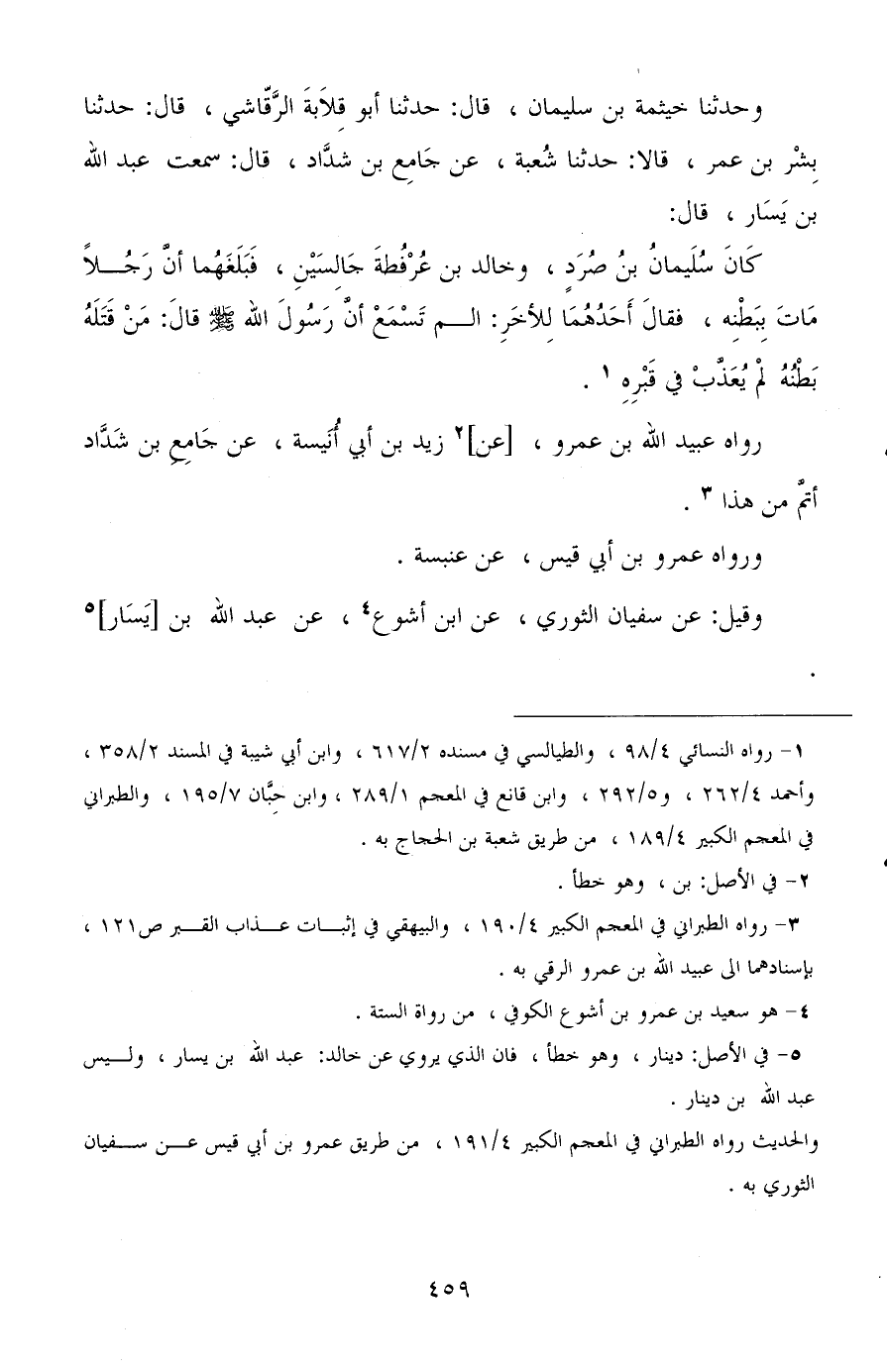 وحدثنا خيثمة بن سليمان، قال: حدثنا أبو قلابة الرقاشي، قال: حدثنا بشر بن عمر، قالا: حدثنا شعبة، عن جامع بن شداد، قال: سمعت عبد الله بن يسار، قال: كان سليمان بن صرد، وخالد بن عرفطة جالسين، فبلغهما أن رجلا مات ببطنه، فقال أحدهما للأخر: الم تسمع أن رسول الله صلى الله عليه وسلم قال: من قتله بطنه لم يعذب في قبره.