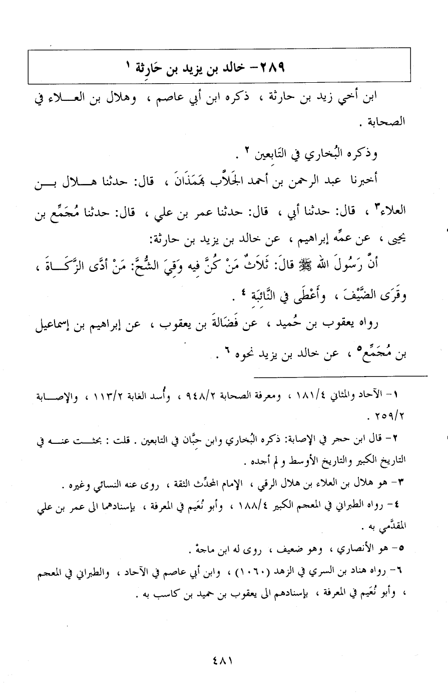 أخبرنا عبد الرحمن بن أحمد الجلاب بهمذان، قال: حدثنا هلال بن العلاء، قال: حدثنا أبي، قال: حدثنا عمر بن علي، قال: حدثنا مجمع بن يحيى، عن عمه إبراهيم، عن خالد بن يزيد بن حارثة: أن رسول الله صلى الله عليه وسلم قال: ثلاث من كن فيه وقي الشح: من أدى الزكاة، وقرى الضيف، وأعطى في النائبة.