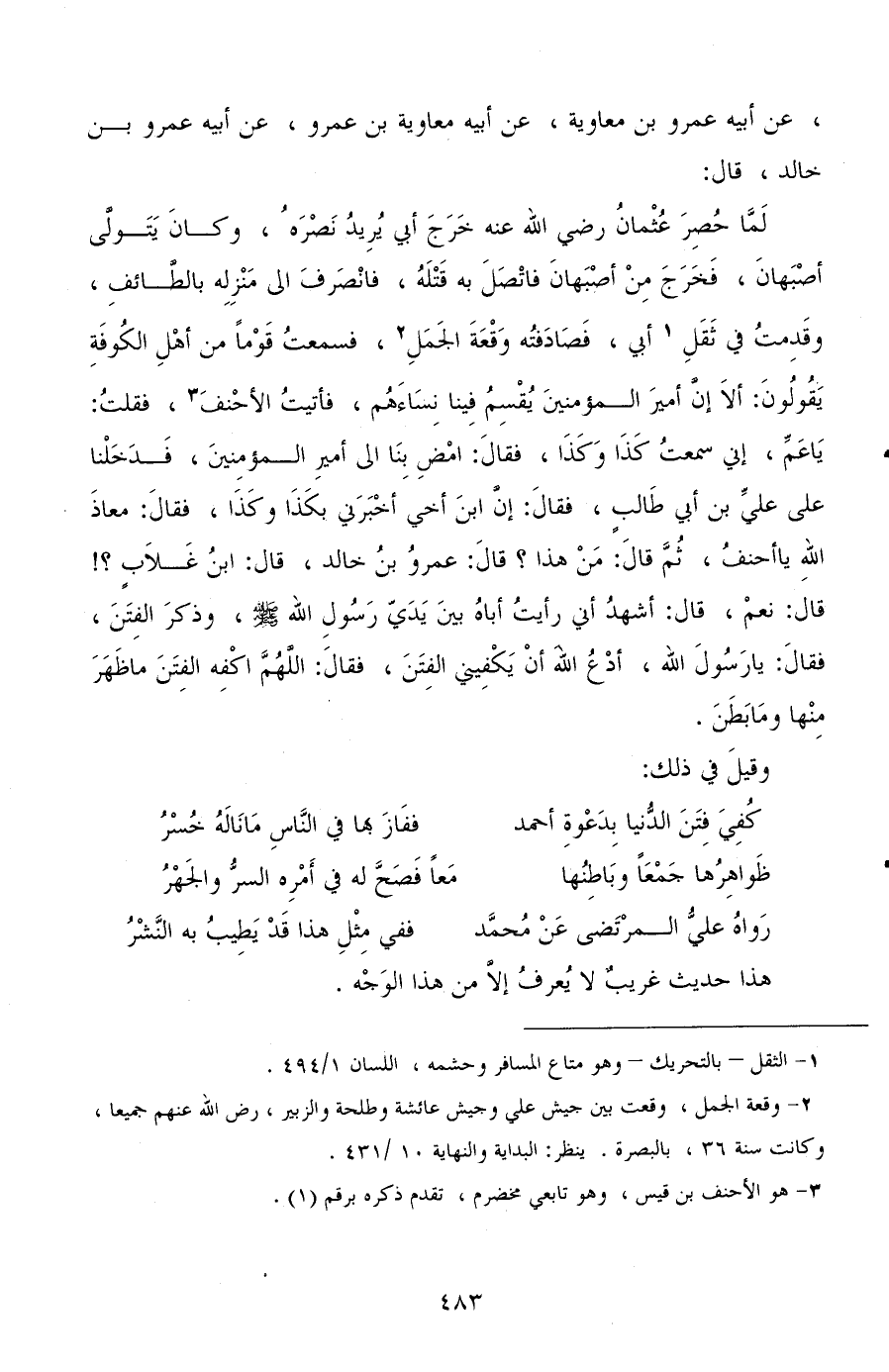 عن أبيه عمرو بن معاوية، عن أبيه معاوية بن عمرو، عن أبيه عمرو بن خالد، قال: لما حصر عثمان رضي الله عنه خرج أبي يريد نصره وكان يتولى أصبهان، فخرج من أصبهان فاتصل به قتله فانصرف إلى منزله بالطائف، وقدمت في ثقل أبي فصادفته وقعة الجمل، فسمعت قومًا من أهل الكوفة يقولون: ألا إن أمير المؤمنين يقسم فينا نساءهم، فأتيت الأحنف فقلت: يا عم، إني سمعت كذا وكذا فقال: امض بنا إلى أمير المؤمنين، فدخلنا على علي بن أبي طالب، فقال: إن ابن أخي أخبرني بكذا وكذا، فقال: معاذ الله يا أحنف ثم قال: من هذا؟ قال: عمرو بن خالد قال: ابن غلاب؟ ! قال: نعم، قال: أشهد أني رأيت أباه بين يدي رسول الله صلى الله عليه وسلم وذكر الفتن، فقال: يا رسول الله أدع الله أن يكفيني الفتن، فقال: اللهم اكفه الفتن ما ظهر منها وما بطن.