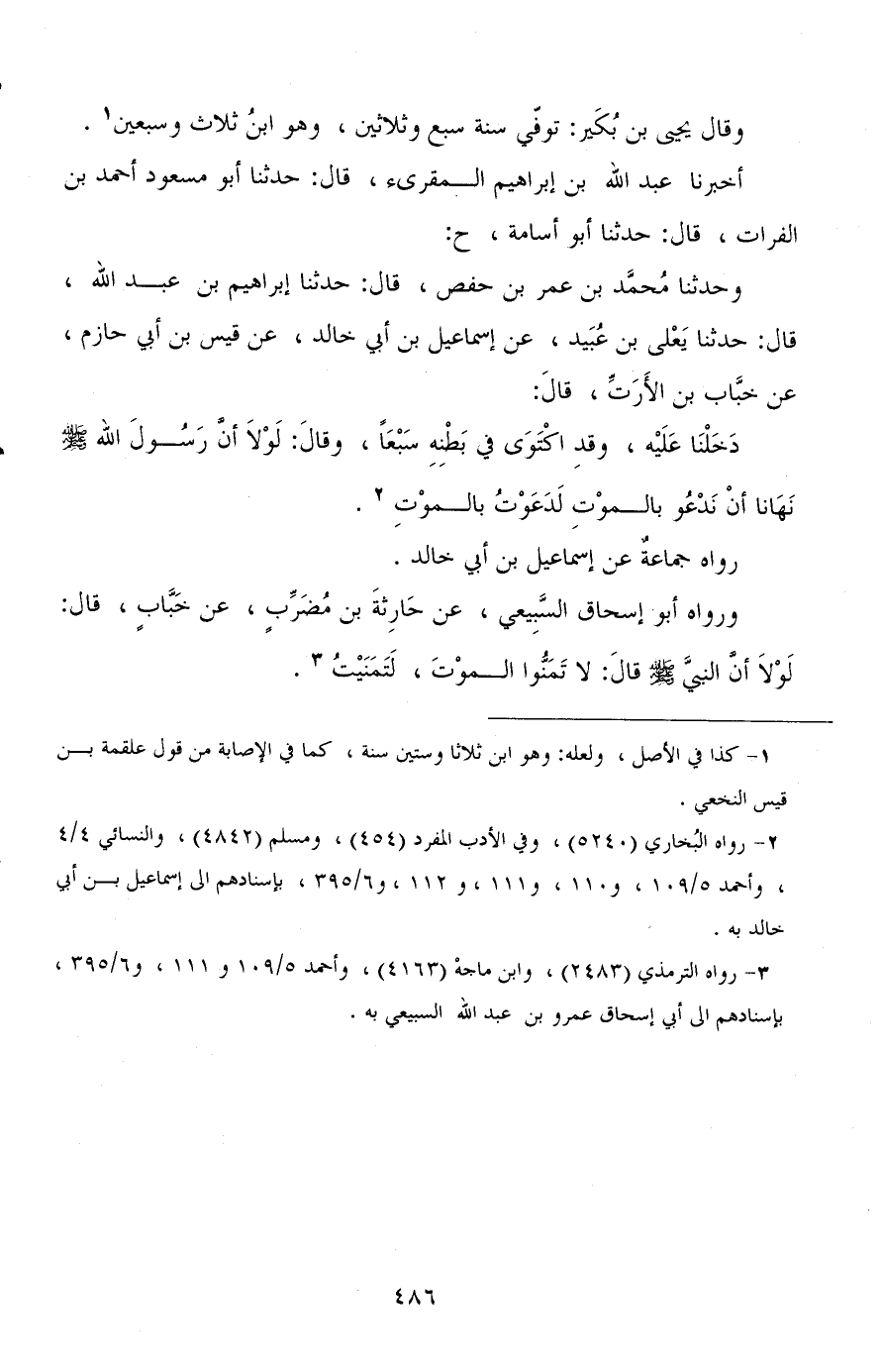 أخبرنا عبد الله بن إبراهيم المقرئ، قال: حدثنا أبو مسعود أحمد بن الفرات، قال: حدثنا أبو أسامة، ح: وحدثنا محمد بن عمر بن حفص، قال: حدثنا إبراهيم بن عبد الله، قال: حدثنا يعلى بن عبيد، عن إسماعيل بن أبي خالد، عن قيس بن أبي حازم، عن خباب بن الأرت، قال: دخلنا عليه وقد اكتوى في بطنه سبعًا، وقال: لولا أن رسول الله صلى الله عليه وسلم نهانا أن ندعو بالموت لدعوت بالموت.