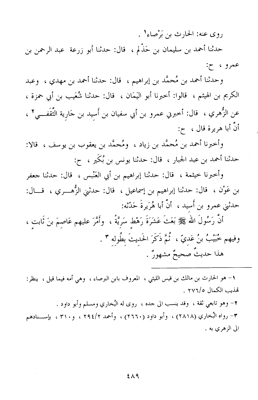 حدثنا أحمد بن سليمان بن حذلم، قال: حدثنا أبو زرعة عبد الرحمن بن عمرو، ح: وحدثنا أحمد بن محمد بن إبراهيم، قال: حدثنا أحمد بن مهدي، وعبد الكريم بن الهيثم، قالوا: أخبرنا أبو اليمان، قال: حدثنا شعيب بن أبي حمزة، عن الزهري، قال: أخبرني عمرو بن أبي سفيان بن أسيد بن جارية الثقفي، أن أبا هريرة قال، ح: وأخبرنا أحمد بن محمد بن زياد، ومحمد بن يعقوب بن يوسف، قالا: حدثنا أحمد بن عبد الجبار، قال: حدثنا يونس بن بكير، ح: وأخبرنا خيثمة، قال: حدثنا إبراهيم بن أبي العنبس، قال: حدثنا جعفر بن عون، قال: حدثنا إبراهيم بن إسماعيل، قال: حدثني الزهري، قال: حدثني عمرو بن أسيد، أن أبا هريرة حدثه: أن رسول الله صلى الله عليه وسلم بعث عشرة رهط سرية، وأمر عليهم عاصم بن ثابت، وفيهم خبيب بن عدي، ثم ذكر الحديث بطوله.