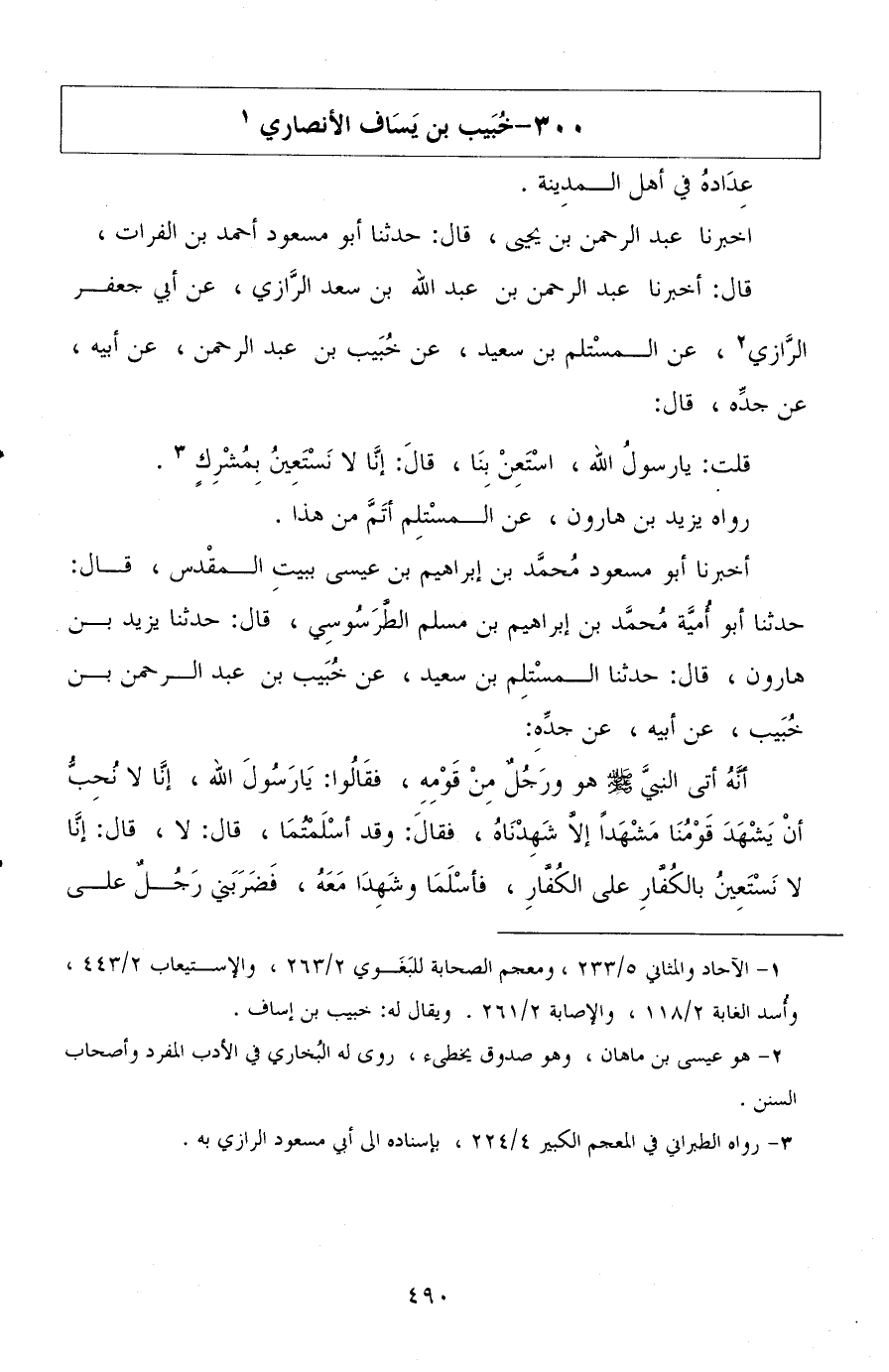 أخبرنا عبد الرحمن بن يحيى، قال: حدثنا أبو مسعود أحمد بن الفرات، قال: أخبرنا عبد الرحمن بن عبد الله بن سعد الرازي، عن أبي جعفر الرازي، عن المستلم بن سعيد، عن خبيب بن عبد الرحمن، عن أبيه، عن جده، قال: قلت: يا رسول الله استعن بنا، قال: إنا لا نستعين بمشرك.