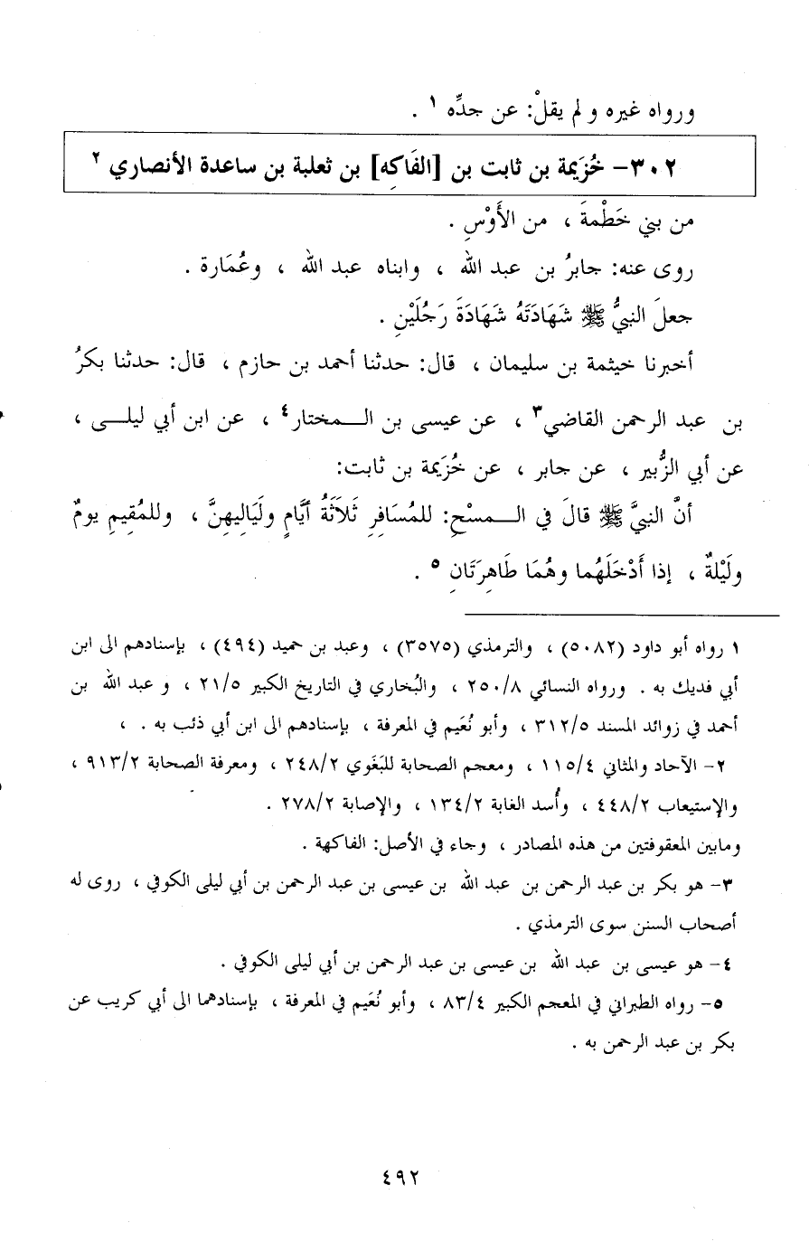 أخبرنا خيثمة بن سليمان، قال: حدثنا أحمد بن حازم، قال: حدثنا بكر بن عبد الرحمن القاضي، عن عيسى بن المختار، عن ابن أبي ليلى، عن أبي الزبير، عن جابر، عن خزيمة بن ثابت: أن النبي صلى الله عليه وسلم قال في المسح للمسافر: ثلاثة أيام ولياليهن، وللمقيم يوم وليلة، إذا أدخلهما وهما طاهرتان.