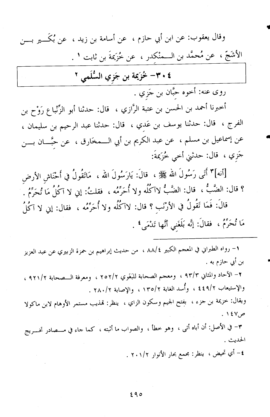 أخبرنا أحمد بن الحسن بن عتبة الرازي، قال: حدثنا أبو الزنباع روح بن الفرج، قال: حدثنا يوسف بن عدي، قال: حدثنا عبد الرحيم بن سليمان، عن إسماعيل بن مسلم، عن عبد الكريم بن أبي المخارق، عن حبان بن جزي، قال: حدثني أخي خزيمة: أنه أتى رسول الله صلى الله عليه وسلم، قال: يا رسول الله، ما تقول في أحناش الأرض؟ قال: الضب، قال: الضب لا آكله ولا أحرمه، فقلت: إني لا آكل ما تحرم.