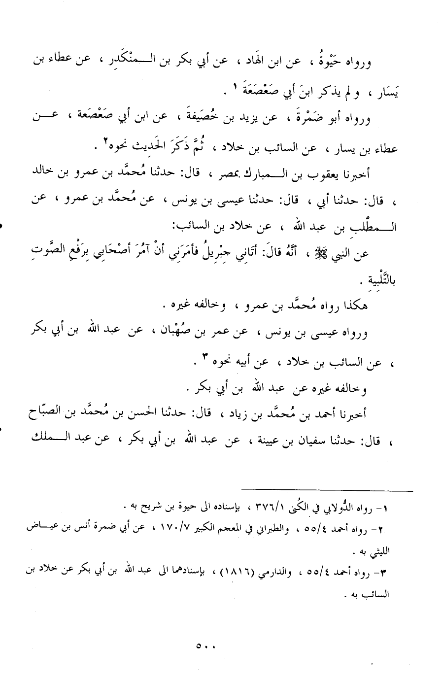 أخبرنا يعقوب بن المبارك بمصر، قال: حدثنا محمد بن عمرو بن خالد، قال: حدثنا أبي، قال: حدثنا عيسى بن يونس، عن محمد بن عمرو، عن المطلب بن عبد الله، عن خلاد بن السائب: عن النبي صلى الله عليه وسلم، أنه قال: أتاني جبريل فأمرني أن آمر أصحابي برفع الصوت بالتلبية.