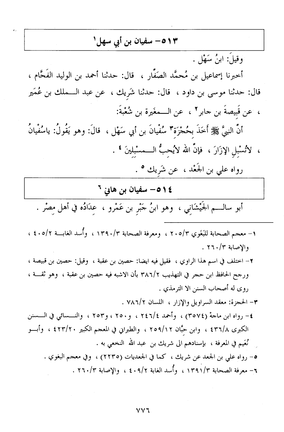 أخبرنا إسماعيل بن محمد الصفار، قال: حدثنا أحمد بن الوليد الفحام، قال: حدثنا موسى بن داود، قال: حدثنا شريك، عن عبد الملك بن عمير، عن قبيصة بن جابر، عن المغيرة بن شعبة: أن النبي صلى الله عليه وسلم أخذ بحجزه سفيان بن أبي سهل، قال: وهو يقول: يا سفيان لا تسبل الإزار، فإن الله لا يحب المسبلين.
