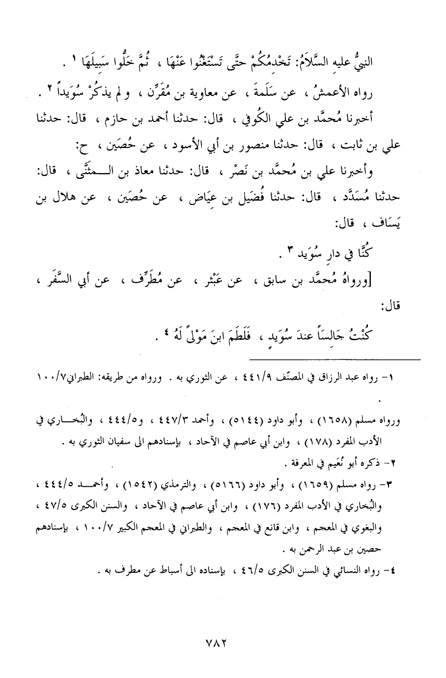 ح وأخبرنا علي بن محمد بن نصر، قال: حدثنا معاذ بن المثنى، قال: حدثنا مسدد، قال: حدثنا فضيل بن عياض، عن حصين، عن هلال بن يساف، قال: كنا في دار سويد.