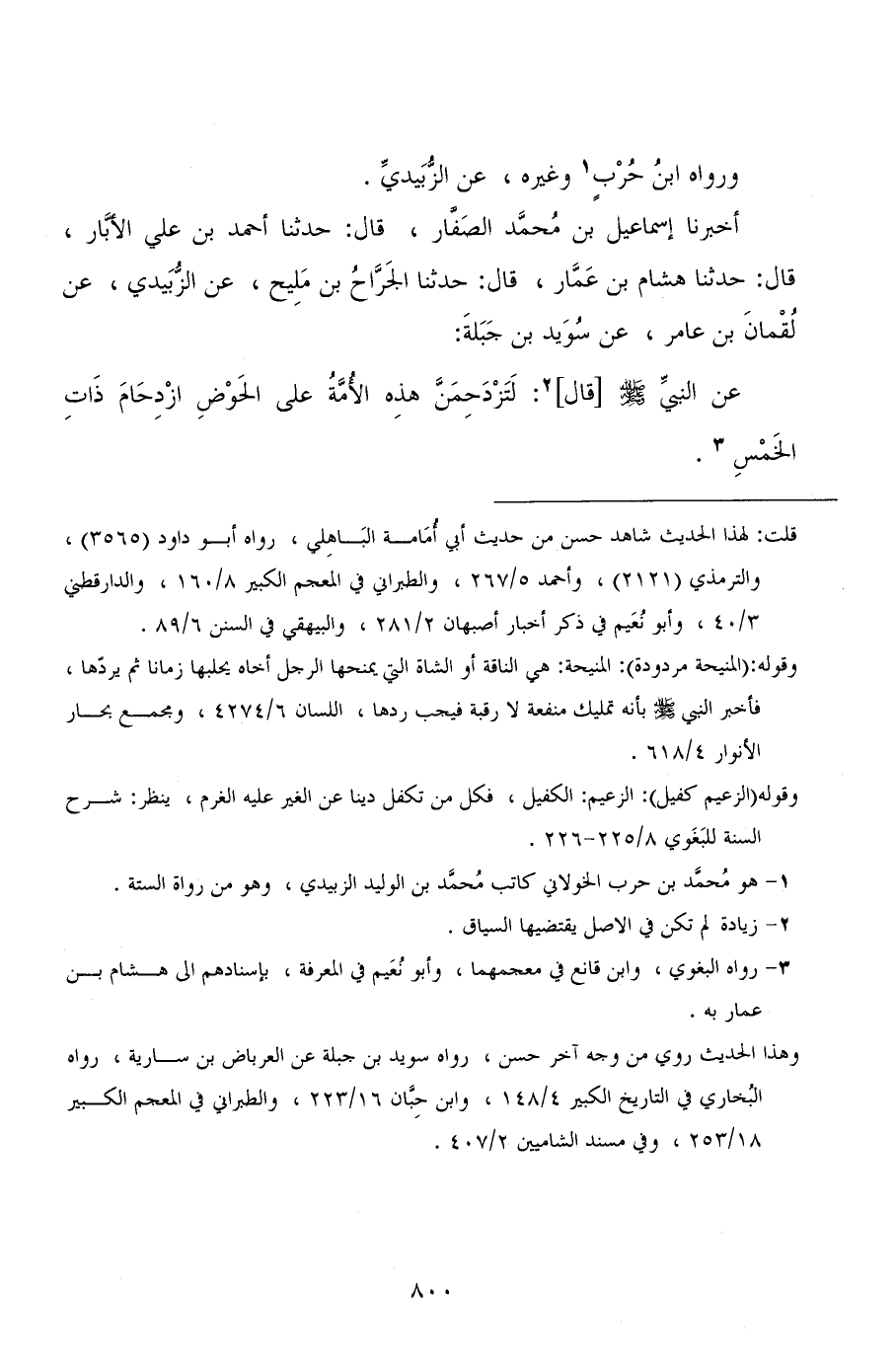 أخبرنا إسماعيل بن محمد الصفار، قال: حدثنا أحمد بن علي الآبار، قال: حدثنا هشام بن عمار، قال: حدثنا الجراح بن مليح، عن الزبيدي، عن لقمان بن عامر، عن سويد بن جبلة: عن النبي صلى الله عليه وسلم قال: لتزدحمن هذه الأمة على الحوض ازدحام ذات الخمس.