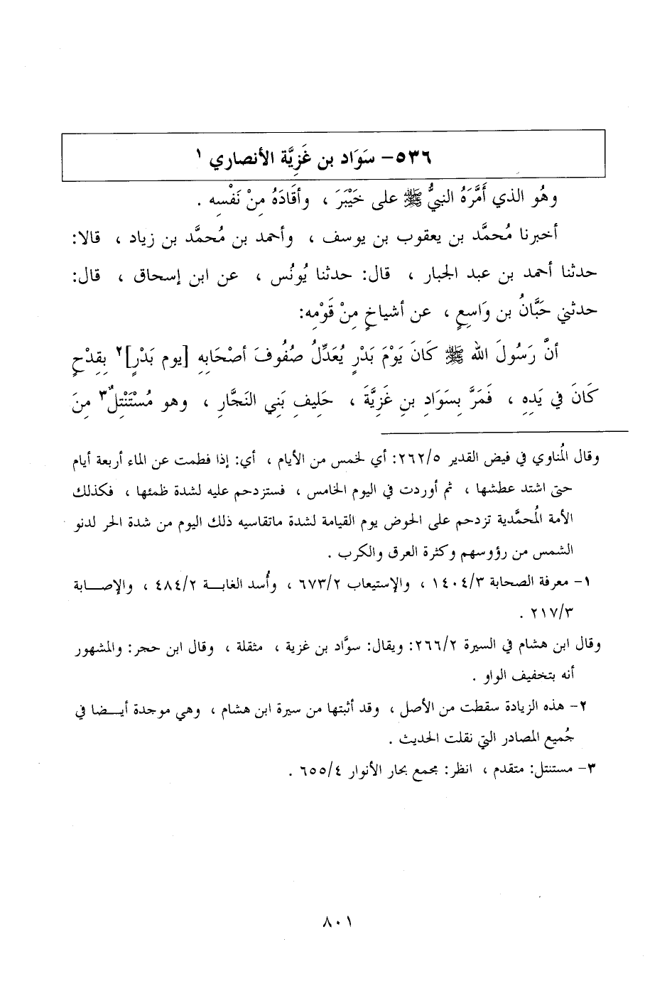 أخبرنا محمد بن يعقوب بن يوسف، وأحمد بن محمد بن زياد، قالا: حدثنا أحمد بن عبد الجبار، قال: حدثنا يونس، عن ابن إسحاق، قال: حدثني حبان بن واسع، عن أشياخ من قومه: أن رسول الله صلى الله عليه وسلم كان يوم بدر يعدل صفوف أصحابه يوم بدر بقدح كان في يده، فمر بسواد بن غزية، حليف بني النجار، وهو مستنتل من